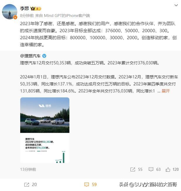 理想汽车在12月份成功完成5万+的销量目标,共卖出50353辆,新势力中第一个达成该成就,可喜可贺。 与此同时,理想汽车CEO李想给出了2024年的预测:800000、100000、30000、2000,这组数据应该对应的是年销量、月销量、单车月销量和充电站。 今年理想汽车的表现确实非常亮眼,各方面都超额完成任务,国内新势力中当之无愧NO.1。 不过明年的目标确实不小,它是否能继续披荆斩棘一路向上?这个答案,明年的这个时候大概就知晓了。#理想# #李想#