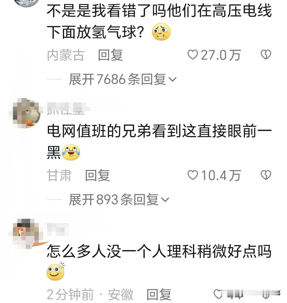 1月1日,湖北武汉跨年夜,狂欢的人们一起放飞气球,没想到气球会飘到电线上,引发爆 炸。 网友:不是我看错了吗?他们在高压电线下面放氢气球? 网友:电网值班的兄弟看到这直接眼前一黑。 网友:这么多人没一个人理科稍微好点吗?