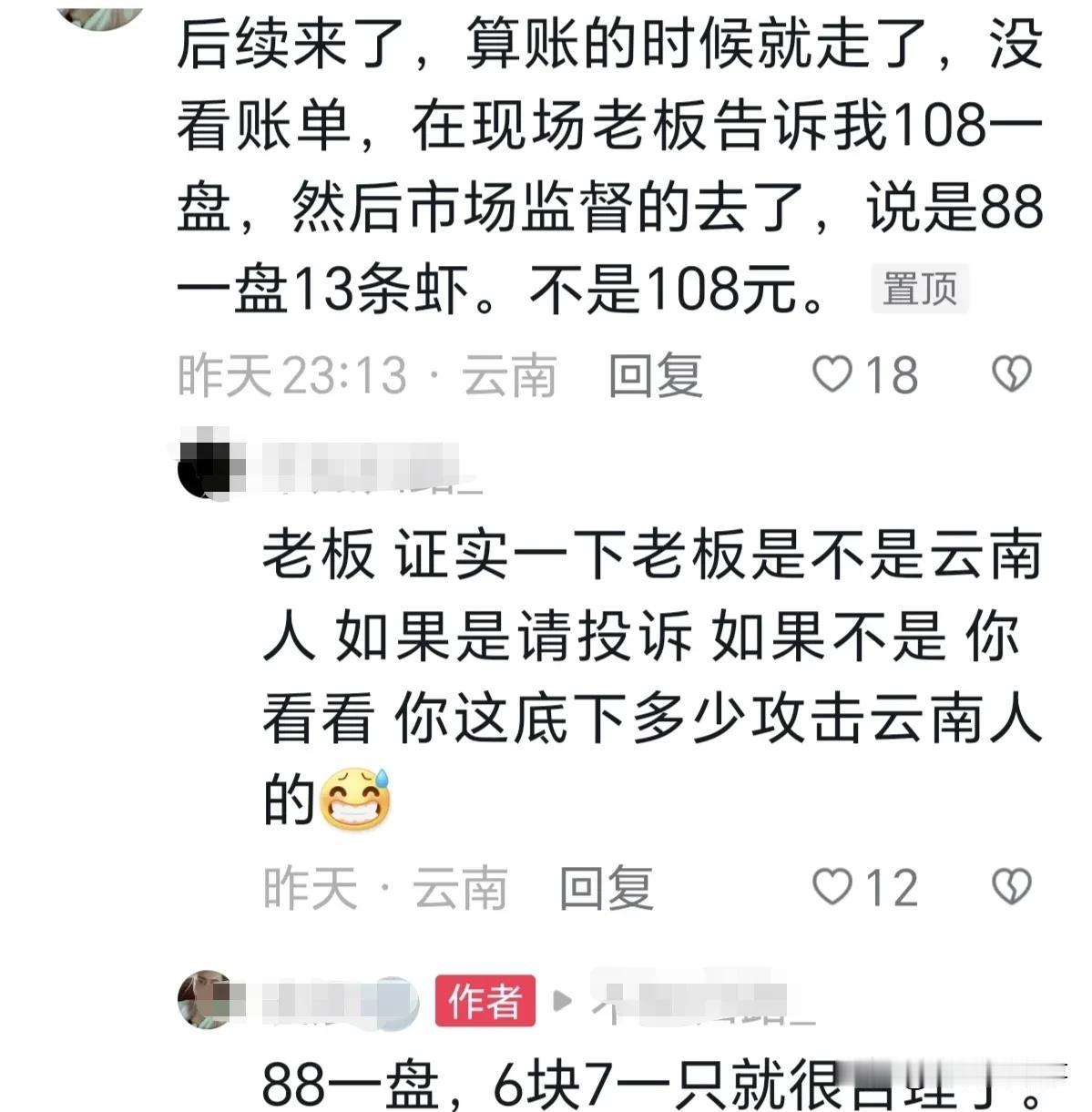 近日云南西双版纳,108元13只虾后续,经有关部门调查是误会,是88元13只虾。 作者:后续来了,算账的时候就走了,没看账单,在现场老板告诉我108一盘,然后市场监督的去了,说是88一盘13条虾,不是108元。 作者:88一盘,6块7一只就很合理了。 网友:还是东北老铁实在吧,68一盘锅包肉,被当地人喷关门了[奸笑]。 网友:这事要发生在哈尔滨那事大了。