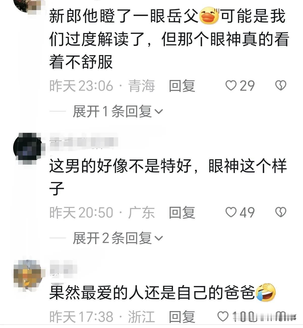 近日河南,婚礼现场父亲担心女儿冷,把自己的衣服脱下给女儿穿上,新郎看了岳父一眼。 网友:这个男人好像不是特好,眼神这个样子。 网友:果然最爱的人还是自己的爸爸。 新娘:爸妈没有不开心,是舍不得自己,回门的时候父母也都把男生当自己孩子。