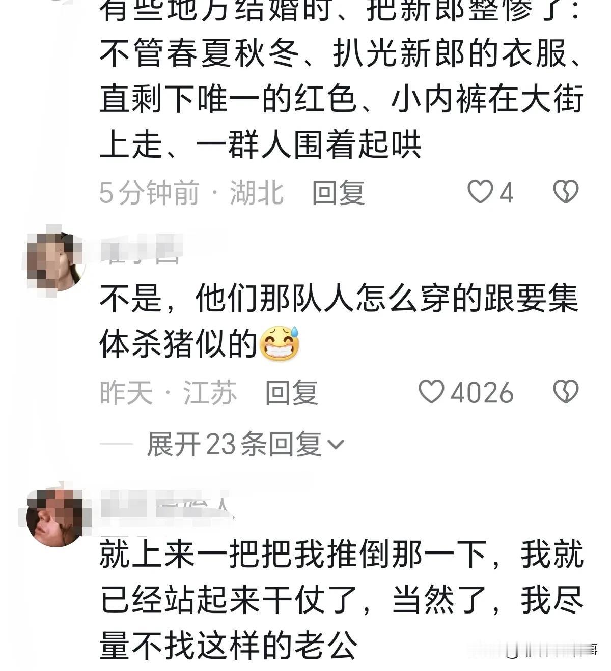 近日湖北荆州,用抢亲的方式接亲你们喜欢吗?新郎带着一群兄弟,直接闯入新娘房间,还没等新娘和新娘亲戚朋友反应过来,几个大小伙子就直接把新娘抬走了。 网友:新郎新娘都没有意见,网友有意见了。 网友:有些地方结婚的、把新郎整惨了,不管春夏秋冬、扒光新郎的衣服、只剩下唯一的红色、小内裤在大街上走、一群人围着起哄。 网友:就上来一把把我推倒那一下,我就已经站起来干仗了,当然了,我尽量不找这样的老公。