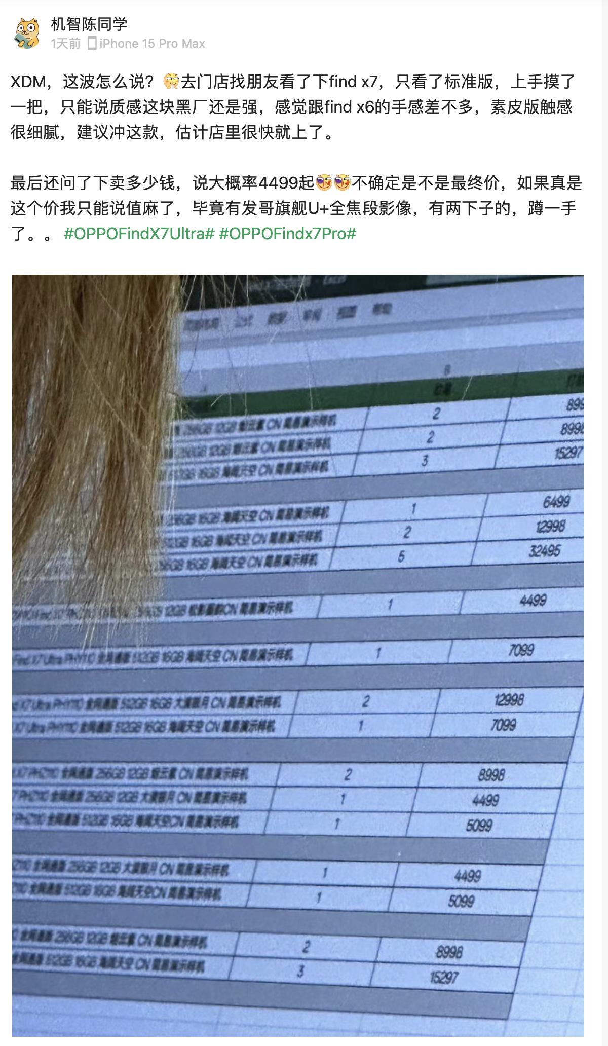 好家伙,华为P70都开始预约了?看到有博主爆料说,部分门店可以预约P70了,而且还有网友晒出了预约单,但这并不是官方安排的,毕竟距离P70发布还有很长时间,估计是部分门店为了噱头搞出来的操作。 这种“抢跑”的情况在行业中其实挺常见的,比如刚官宣不久的OPPO Find X7系列,目前就有大V透露悄悄体验了一下。根据爱丽丝RUN的描述来看,OPPO Find X7标准版的硬件堆料还是很有诚意的,不仅有天玑9300旗舰处理器,而且还有全焦段哈苏影像,比肩上一代Find X6 Pro机型,网传定价4.5K左右,用中杯的价格就能获得大杯的体验,不得不说OPPO Find X7系列有两下子的,预算在4-5K的用户建议蹲一手。 #OPPO Find X7# #OPPO Find X7系列搭载双潜望#