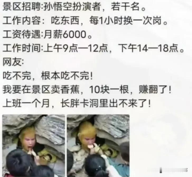 网传河北邯郸一景区6000元每月,招聘若干人扮演孙悟空,主要工作是趴在洞里吃东西