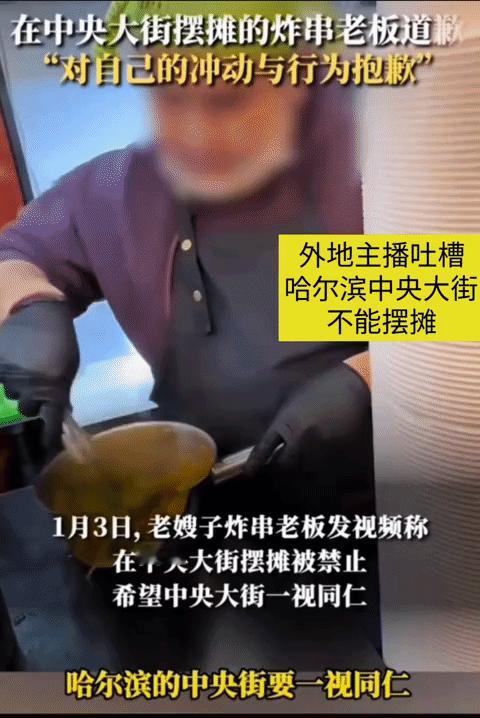 老嫂子炸串老板发视频,给哈尔滨道歉。 原因是他前几天发视频,吐槽哈尔滨中央大街不