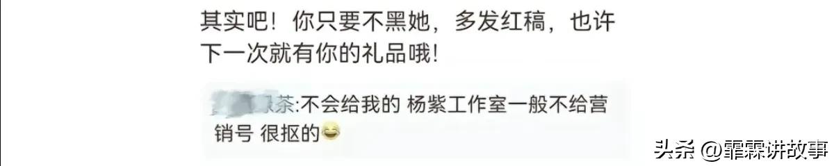 总是黑杨紫的营销号,吐槽杨紫工作室很抠门,价值4000元的礼盒,只给她的宣发,都不给营销号。 网友:其实吧!你只要不黑她,多发红稿,也许下一次就有你的礼品了哦! 网友:你天天黑人家,还指望着工作室给4000 元礼盒,你没事吧?不给你才正常吧!