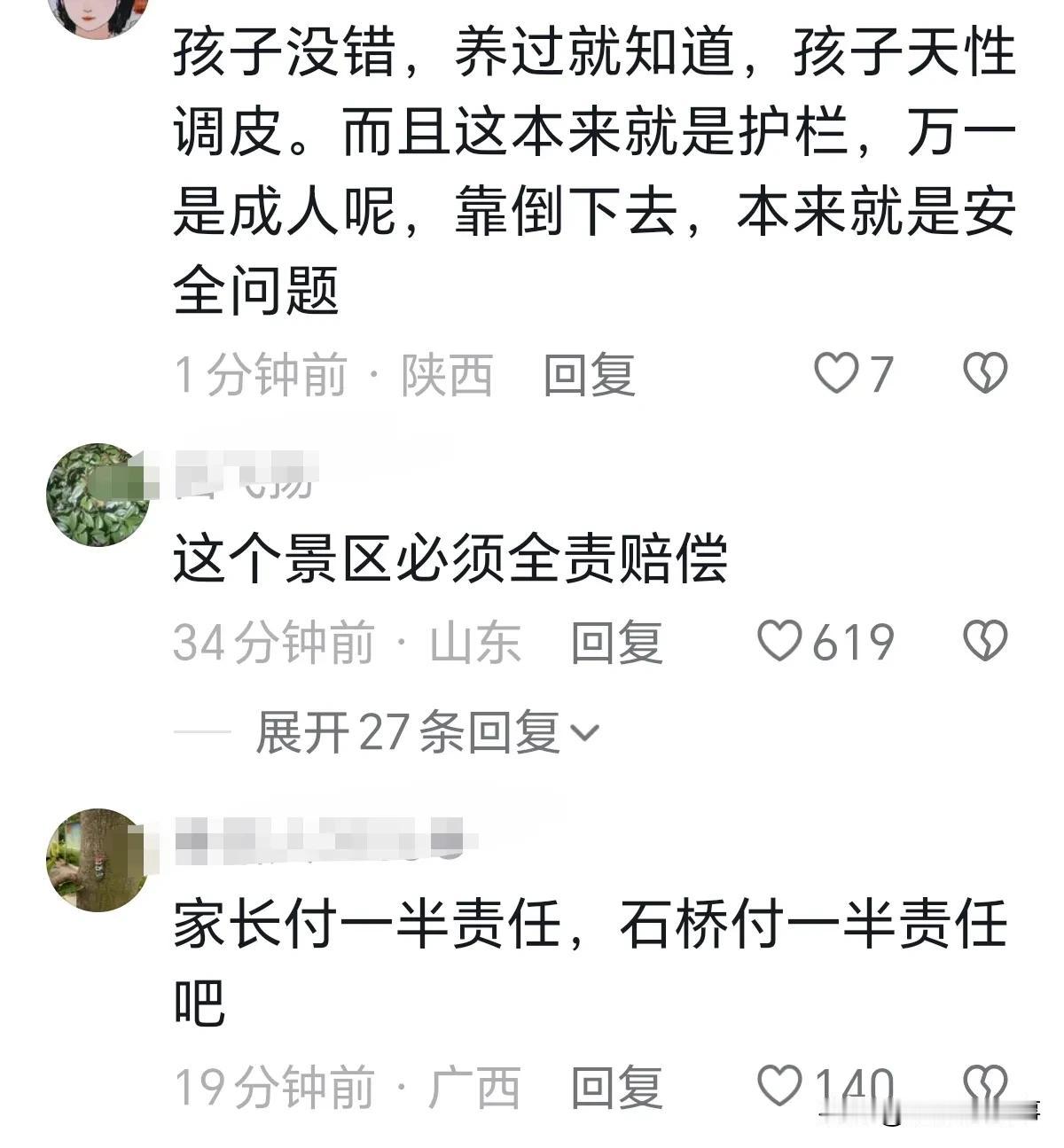 近日云南西双版纳,某景区两个小孩玩耍爬石桥,结果石桥倒了下来,砸死其中一个小女孩,男孩家属称相关责任人一直不出面,景区把所有事情推脱干净,不解释石桥质量问题导致的死亡,连医药费都是自己垫付。目前,已向法院起诉。 你们认为女孩死亡男孩受伤,责任在谁? 网友:家长没看好孩子,家长也有责任。 网友:质量确实有问题,如果是成人倚靠护栏,很可能坠桥受伤甚至死亡。