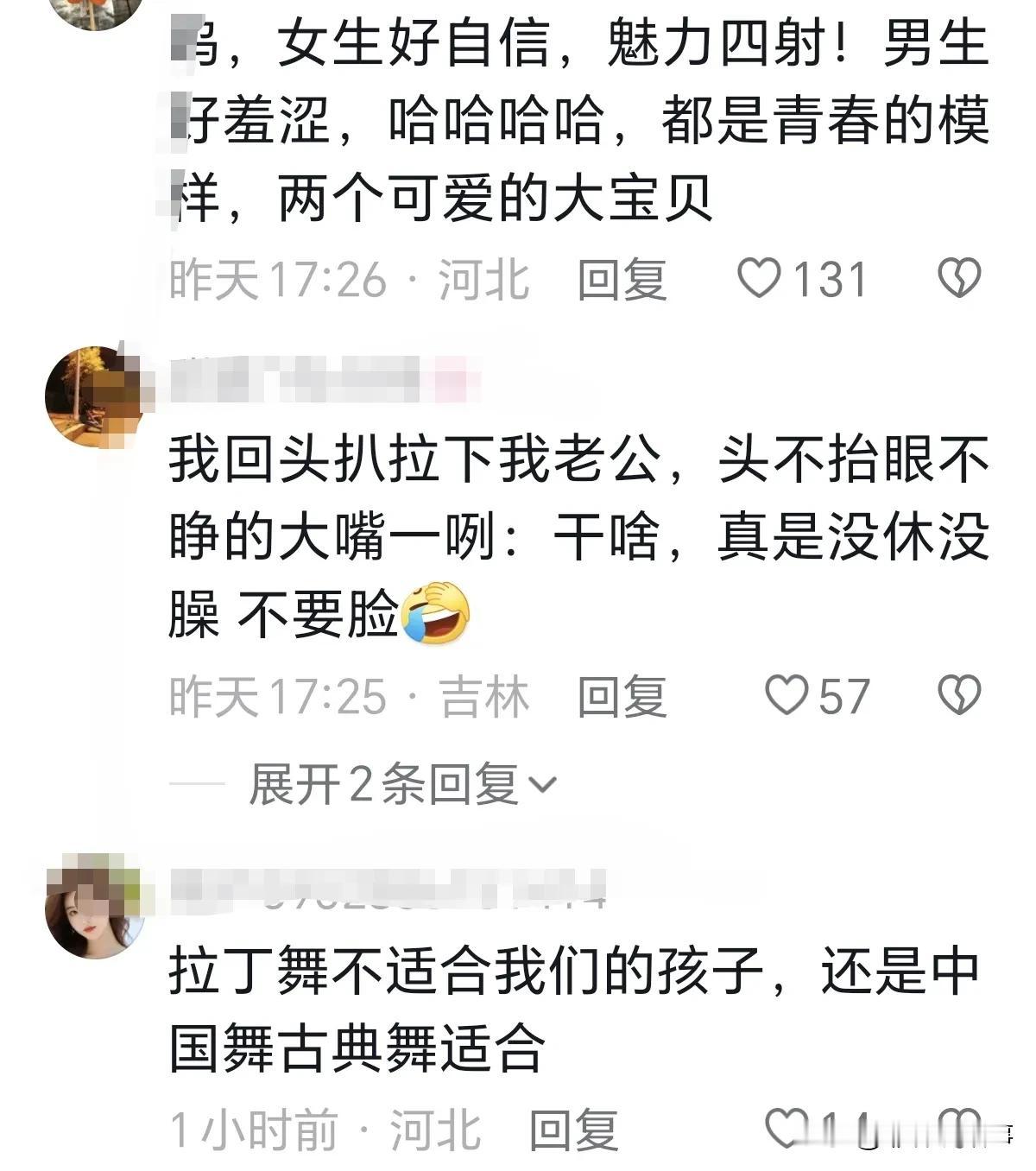 学生晚会表演,女孩跳起了拉丁舞,只是简单的舞蹈动作,男学生就害羞的捂起了脸,这大概就是学生时代才有的羞涩吧! 网友:女生好自信,活力四射!男生羞涩,青春的模样,两个可爱的大宝贝。 网友:拉丁舞不适合我们的孩子,还是中国舞古典舞适合。