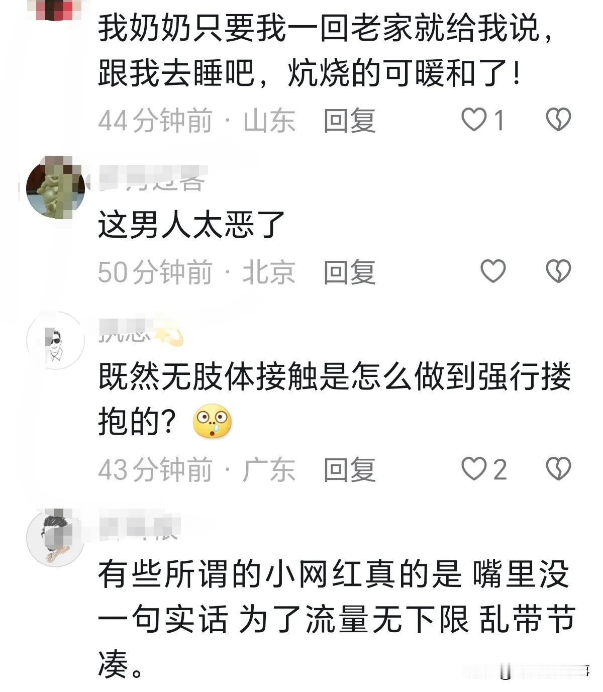 反转了,浙江丽水健身男,深夜遭老太强行搂抱性骚扰? 老奶奶儿子通过监控还原事实真相,他的母亲80岁了,患有老年痴呆症。 从监控里显示健身男和老奶奶,始终间隔五六米,老奶奶根本没有抱健身男,全程无肢体接触,健身男拍下视频后离开,老奶奶因为老年痴呆症把健身男误认成家人,所以提醒健身男,家里还有一张床是空的,并没有像健身男说的什么强行搂抱他,老奶奶没有性骚扰健身男。 网友:都没有接触,怎么做到强行搂抱? 网友:网红嘴里没真话,为了流量没下限。