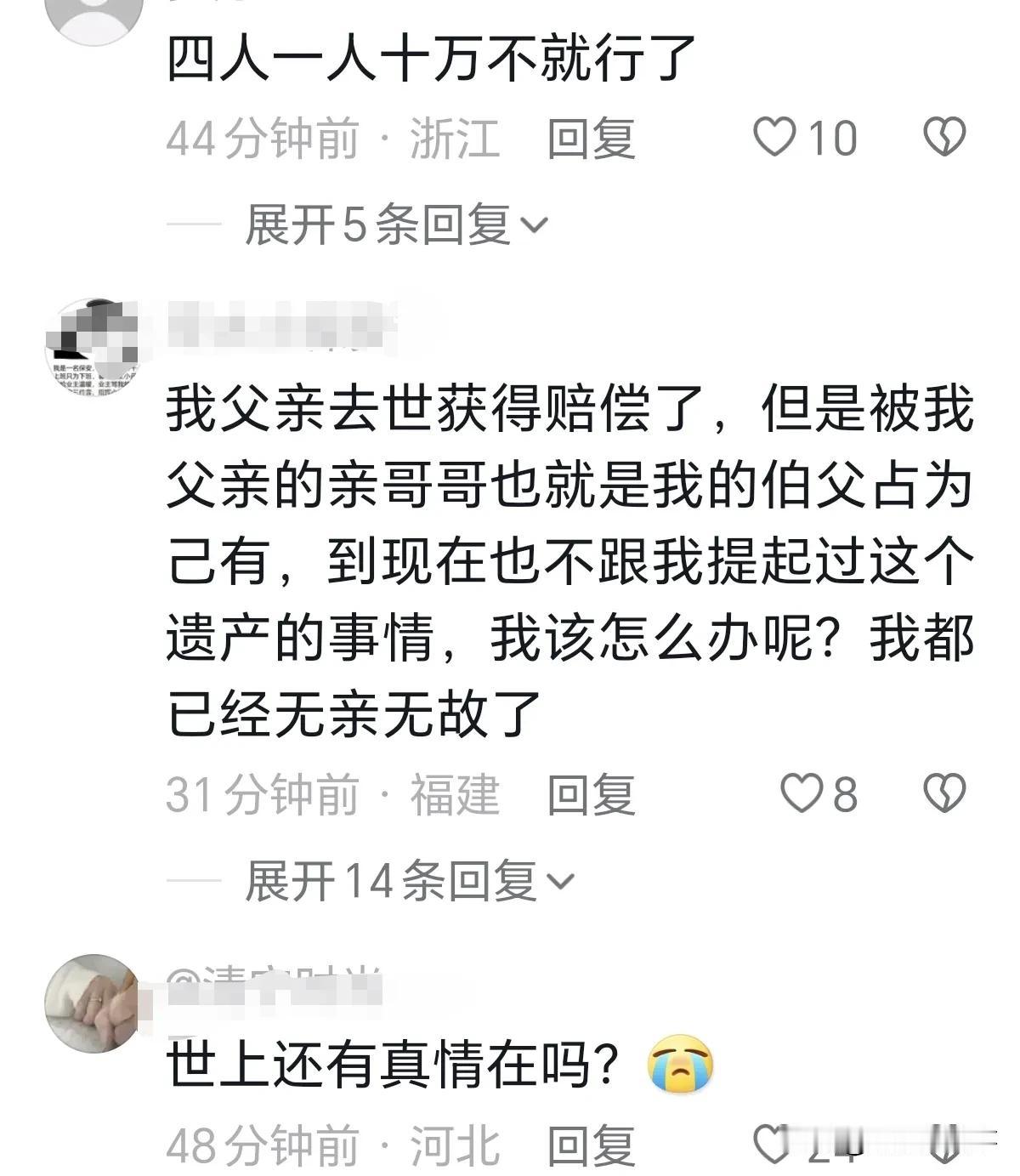 有这种兄弟姐妹真是十分的倒霉,男子因车祸去世获赔40万,无父无母无妻子孩子,四个兄弟姐妹吃兄弟的馒头血,因为争夺40万赔偿款,一年未将死去的兄弟安葬。 法院:先安葬才能分割相关财产,按照比例分配财产。 网友:我父亲去世获得赔偿了,但是被我父亲的亲哥哥也就是我的伯父占为己有,到现在也不跟我提起过这个遗产的事情,我该怎么办呢?我都已经无亲无故了。 网友:世上还有真情在吗?