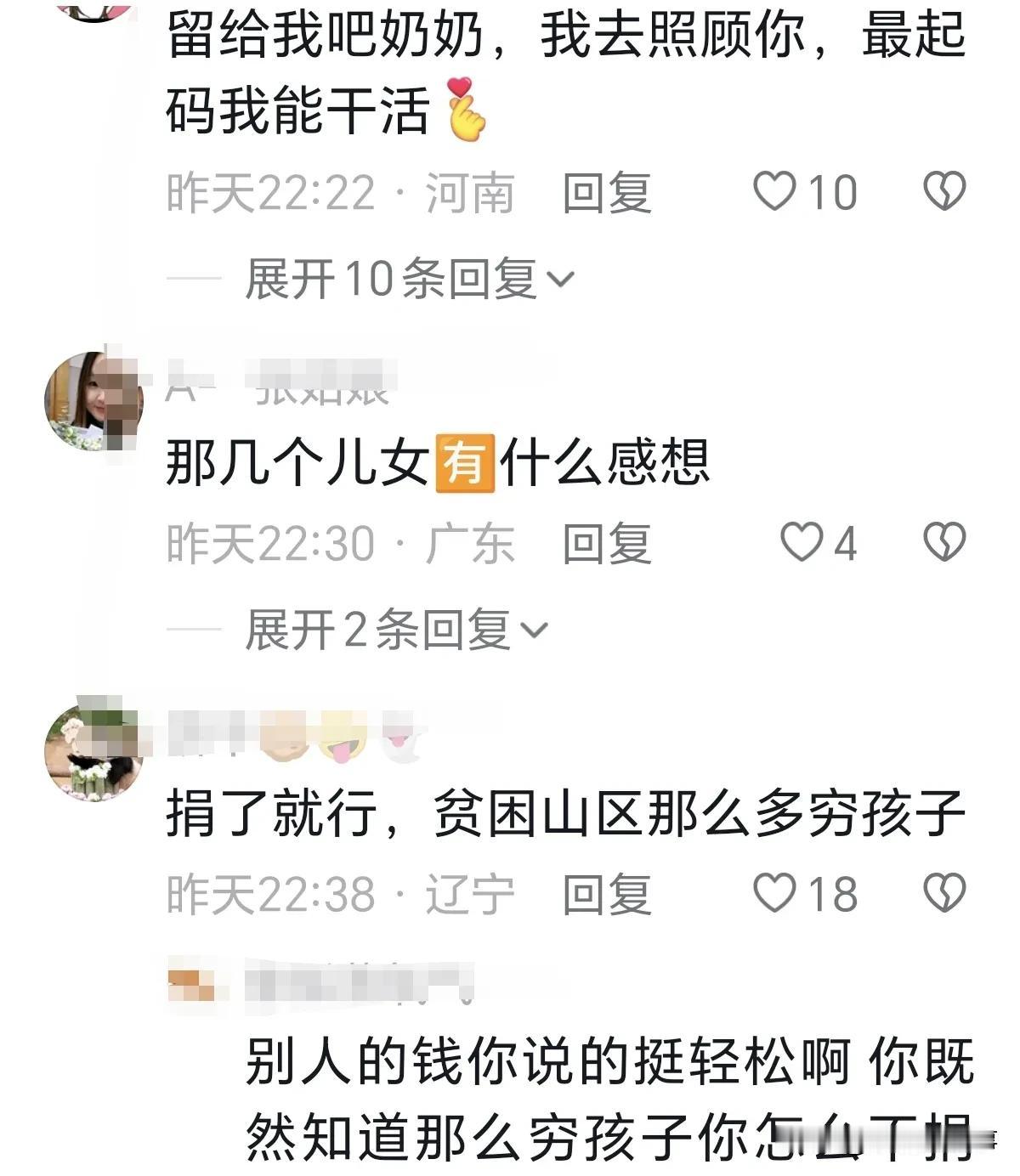 上海一老人生病没人管改立遗嘱,将原本留给三名子女价值2000万的三套房,改立遗嘱留给了陪伴自己的的宠物。 网友:留给我吧奶奶!我去照顾你,最起码我能干活。 网友:那几个儿女有什么感想? 网友:捐了就行,贫困山区那么多孩子。 网友:别人的钱你说的挺轻松,你既然知道那么多穷孩子,你怎么不捐?