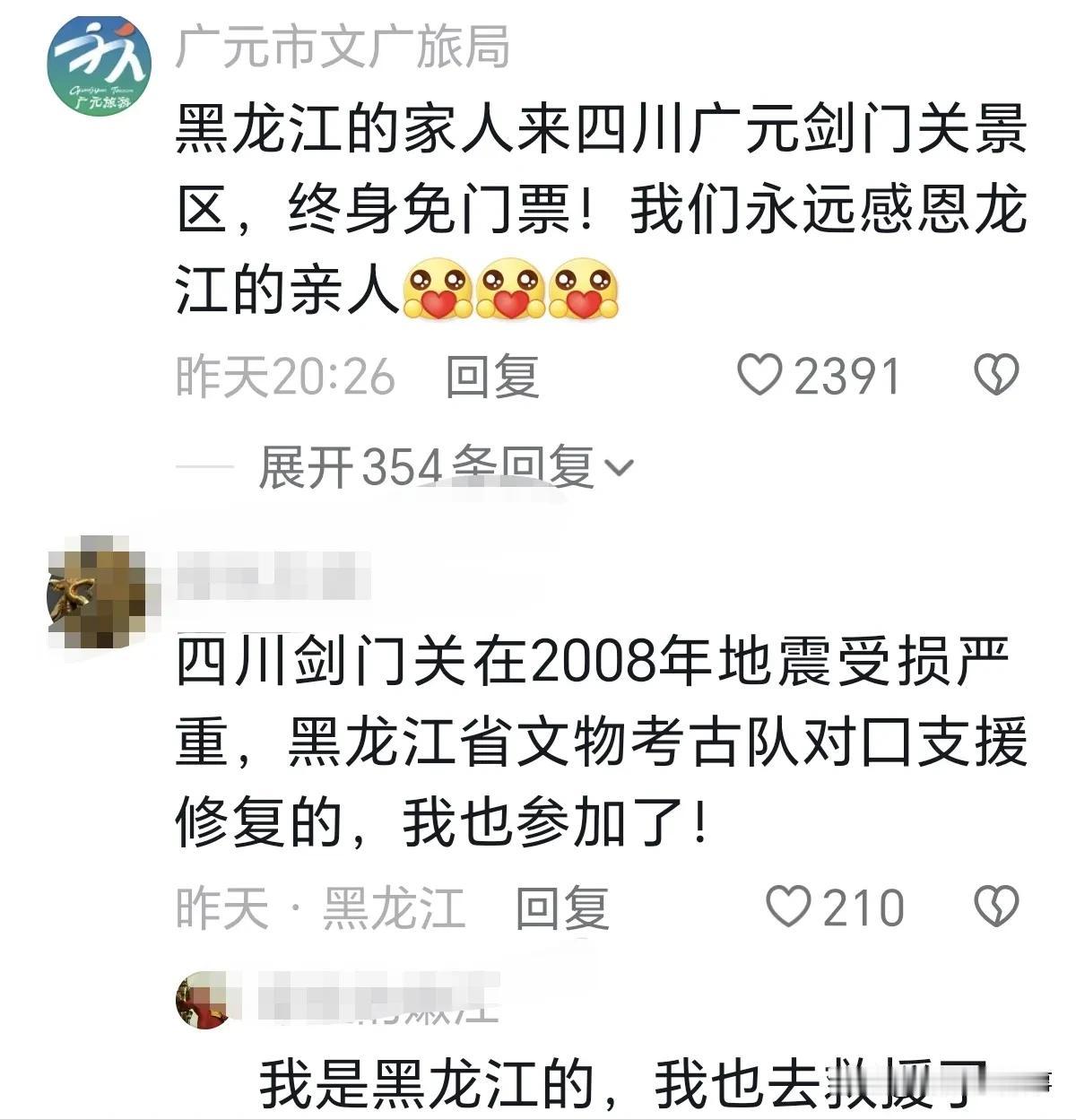 四川广元市文广旅局:黑龙江的家人来四川广元剑门关景区,终身免门票!我们永远感恩龙江的亲人。 好多人问为啥给黑龙江朋友们免门票?评论区网友回复了原因。 黑龙江网友:四川剑门关在2008年地震受损严重,黑龙江省文物考古队对口支援修复的,我也参加了! 黑龙江网友:我是黑龙江的,我也去救援了。 网友:黑龙江还做了多少好事,是我们不知道的?