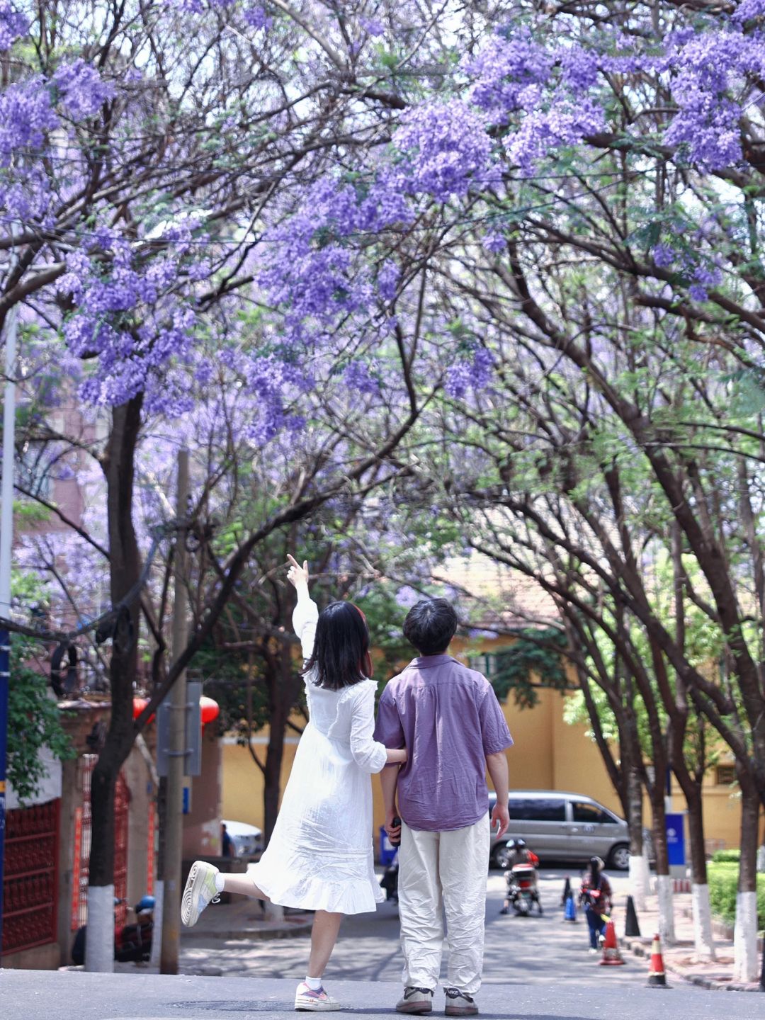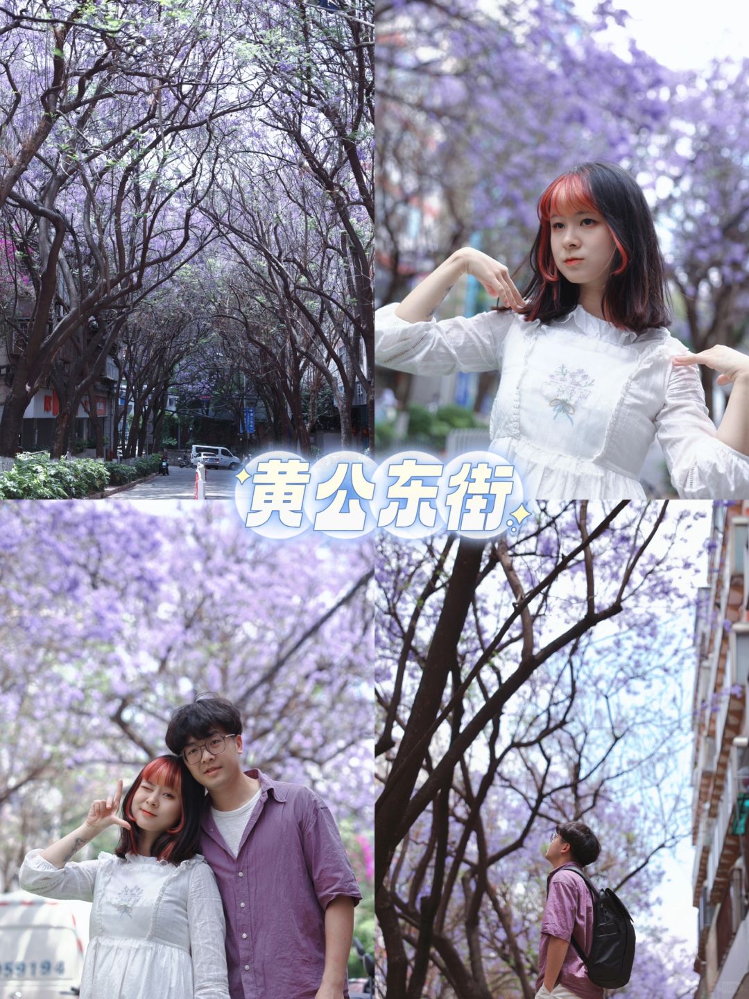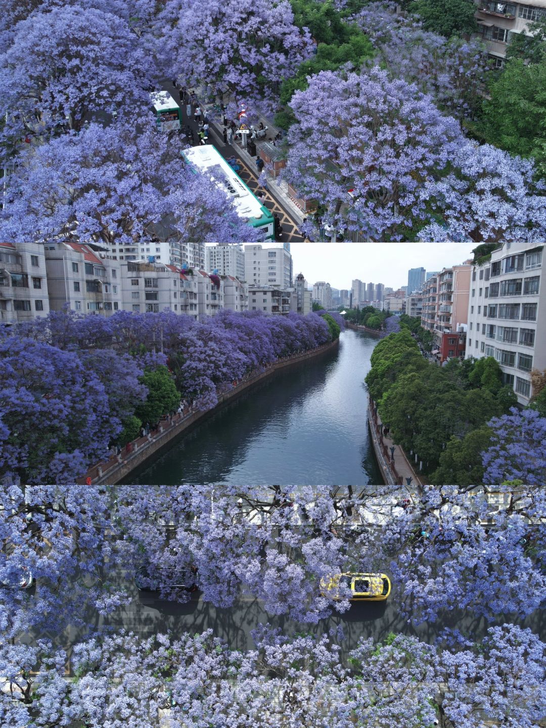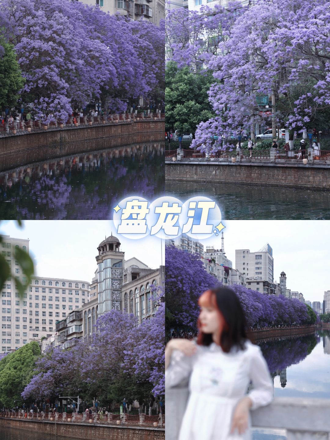 暴走昆明2天!6个蓝花楹观赏点攻略给你! 昆明的蓝花楹花期4月下旬-5月中旬! 逛了6个观赏点,结合自己的亲身感受,新鲜出炉这篇攻略!要去看花的朋友速马! - ❶『教场中路』 🌟花枝最繁盛,还有市集、主题打卡展 🌸体验:这里的蓝花楹最出名最密集了,路两侧有涂鸦墙,五一期间还有市集、周边售卖! 更适合用无人机拍摄,很惊艳! 👨👩👧👦拥挤程度:很多人,拍好照的奥义是仰拍 📍最佳观赏点在“五华区莲华小学”、“莲华综合市场”附近,这2个地方的蓝花楹开的更浓郁! 🔖Tips:可以买蓝花楹冰淇淋打卡!10元一个 - ❷『油管桥铁道』 🌟与废弃铁路结合,拍人像超出片! 🌸体验:这里其实只有一棵较大的蓝花楹,略显单薄,但废弃的铁路桥是个亮点,头图就是在这里拍出来的,拍人像可以来 👨👩👧👦拥挤程度:较多人,只有一小段桥出片 📍位置:导航“昆明水文局宿舍” 🔖Tips:铁道上走路要小心 - ❸『春城路』 🌟可以贴着蓝花楹拍照的地方! 🌸体验:并不像网上宣传的人那么少,新晋网红了属于是,最大的特色是有一条小巷子,地势较高,几乎可以触碰到围墙外生长的蓝花楹!可拍到图6那种离花很近的人像 👨👦👦拥挤程度:较多人,但比教场中路少很多 📍位置:春城路导航到“泰隆宏瑞饭店” - ❹『黄公东路』 🌟和网红墙的结合 🌸蓝花楹数量多,且这里都是居民区,安逸清净!临近翠湖公园,和昆明著名的网红墙就挨着,可以拍到远处的黄墙和蓝花楹(图3) 👩👦拥挤程度:较少人!快冲 📍位置信息,导航“苹果西咖啡馆” - ❺『盘龙江沿岸』 🌟看紫色的江水 🌸说盘龙江多少有些泛了,如果只挑一处可以选桃源广场这一代,花开在西岸,紫色的花把水都染成紫色了,有一些花枝都要垂到水面了,非常有意境 👨👩👧👧拥挤程度:西岸那边人多一些,可以从东岸拍过去 📍位置:导航到桃源广场、鸿城广场 - ❻『江滨西路』 🌟有生活气息的小众观测地! 🌸体验:这里离油管桥铁道非常近,旁边有学校、小卖铺之类,蛮有生活气息,不过这块有些稀疏,无人机可以拍到好看的全景,拍人像可不考虑 👩👦拥挤程度:较少人 📍地址:导航到“五华区小菜园村社区卫生服务站”