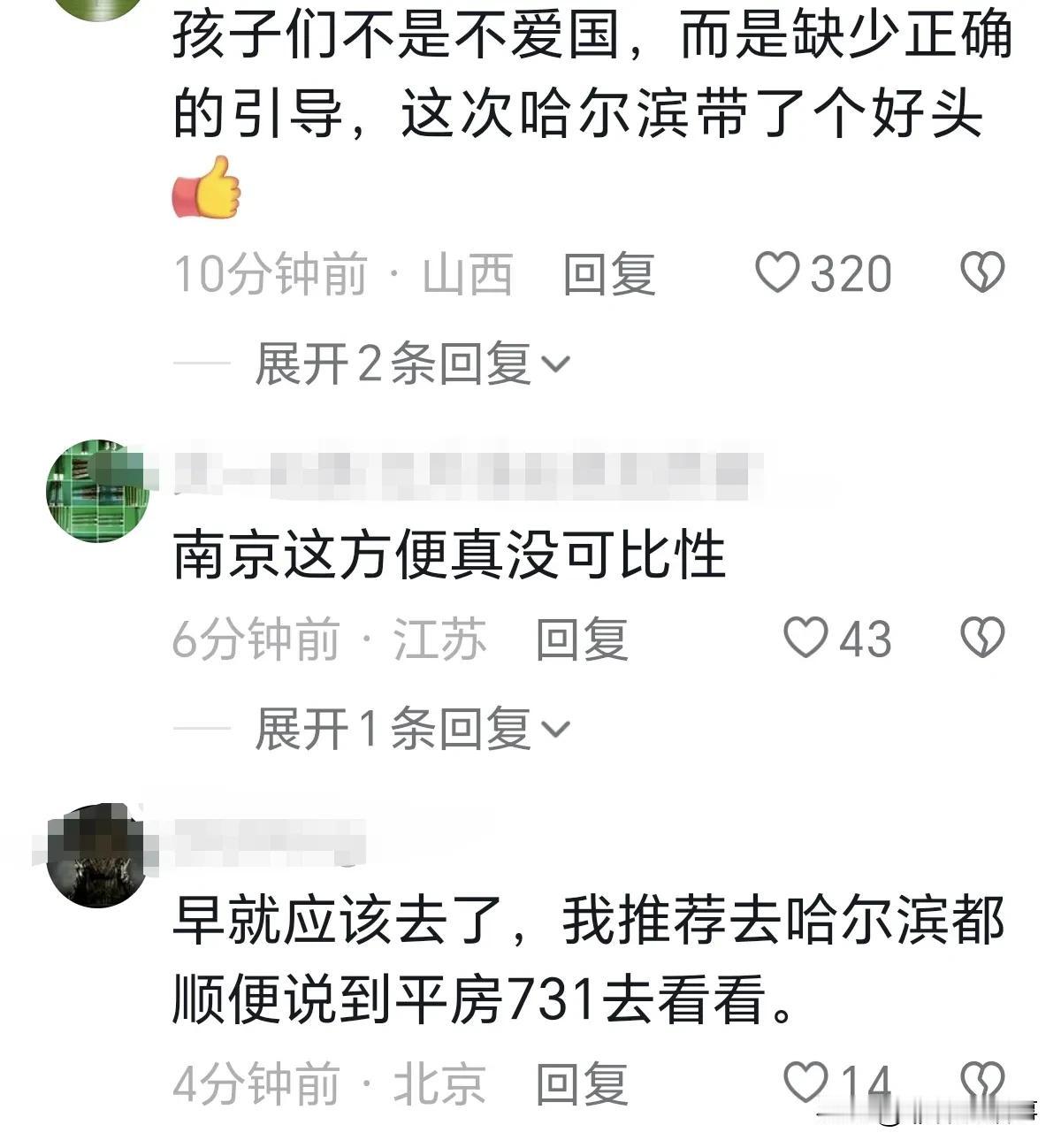 哈尔滨文旅把旅游变成了爱国主义教育,感觉这样的旅游真的很有意义,玩几天开心几天之后,最后一天去731会让你深刻的体会到,今天的幸福生活的来之不易。 网友:孩子们不是不爱国,而是缺少正确的引导,这次哈尔滨带了个好头 网友:早就应该去了,我推荐去哈尔滨都顺便去到平房731去看看。