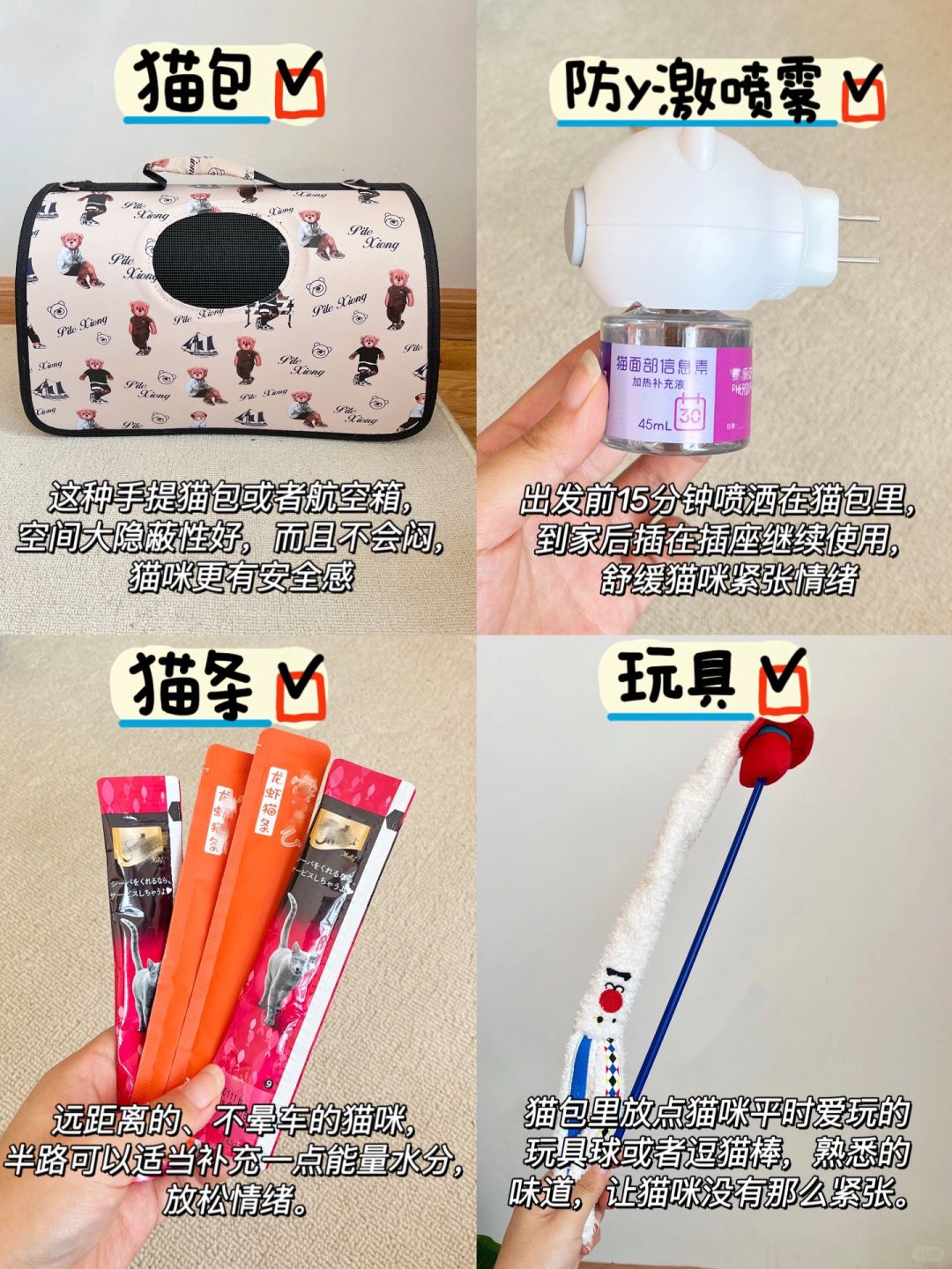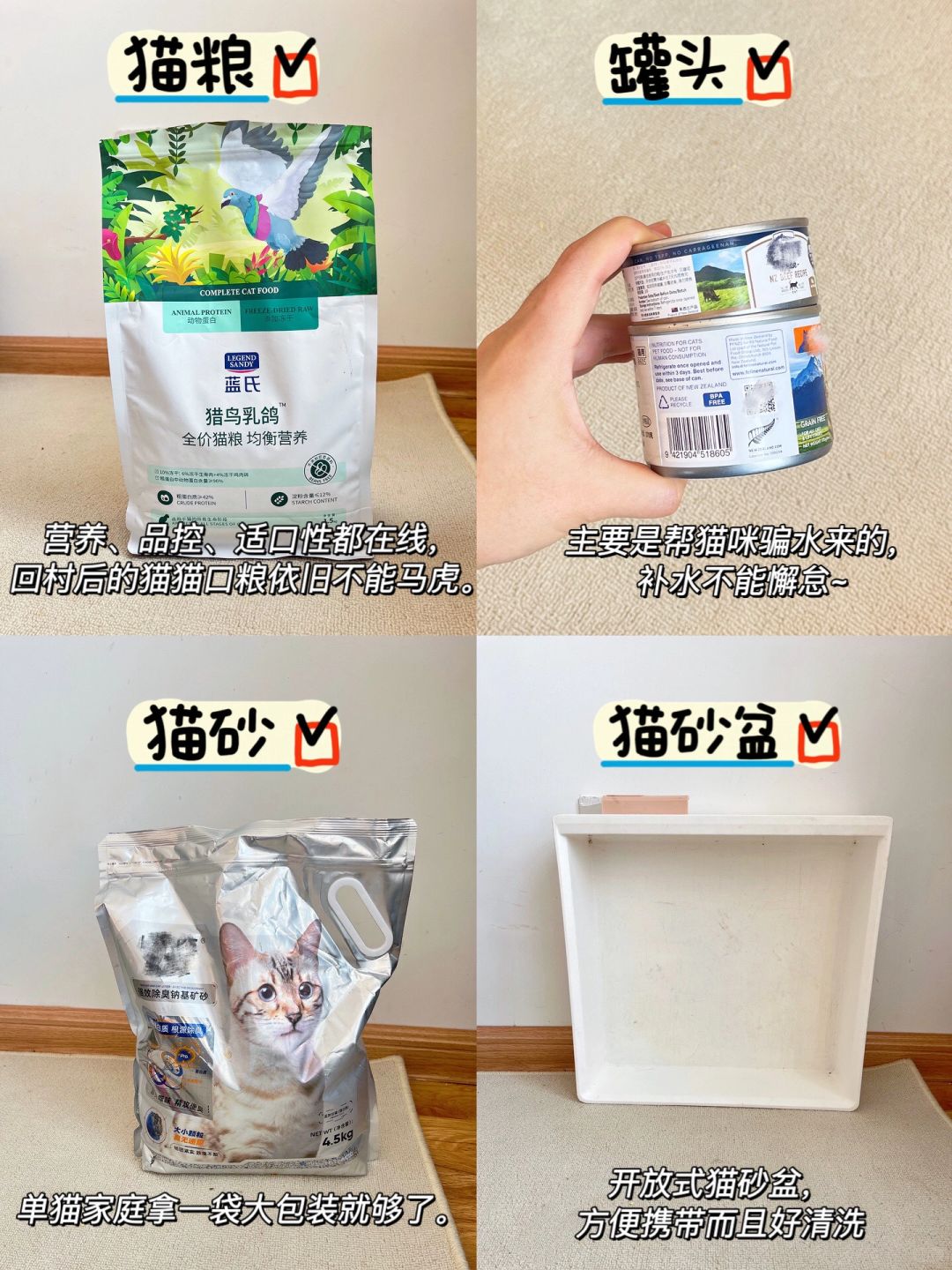 带猫回村过年🧨好物攻略|整装待发❗️ 忙忙碌碌又一年,马上过年啦,养了🐱毛孩子就多了份牵挂,不放心寄养,也不放心留守,so~第一批回村的猫已就位! - 带猫回老家过年哪些才是实用好物❓根据我以往的经验: - ✅航空箱:空间宽敞且隐秘性好,猫咪更有安全感,不会觉得闷。 ✅猫玩具:放在航空箱里,猫咪闻到熟悉的气味更安心。 ✅防应激喷雾:提前15分钟喷在航空箱里,到家后也可以喷洒一些。 ✅猫粮:过年猫猫也得炫点“硬菜”,我带的是蓝氏乳鸽冻干猫粮,家里猫一直吃这款,当时选择它就因为各方面都能打,符合我心中的高分猫粮标准。 肉肉非常多,配料表前2位都是肉,动物原料占比达91%,而且这一袋猫粮含有2只乳鸽,俗话说,一鸽胜九鸡,营养价值那是没得说! 淀粉含量很低,还不到12%,粗蛋白高达42%,猫粮高蛋白低淀粉的搭配更适合猫猫,科学长肉不虚胖。 无谷无豆是基本啦,此外还加了后生元和益生菌 护肠胃助消化,肠胃🈚负担,有一副好肠胃,回家过年不担心软便拉肚肚~ 蓝氏这个猫粮夹心甜甜圈+冻干生骨肉的设计,也是拿捏住我家猫咪了,挑食怪一口爱上,就吃吧,一吃一个不吱声。 当然,猫粮品控也很重要,蓝氏14年国产大品牌,没有过翻车事件,研发实力强,猫粮还批批送检,吃着very放心! ✅猫罐头:偶尔给猫咪骗骗水。 ✅猫条:远距离的,半路喂一根,舒缓猫咪情绪。 ✅猫梳子:每天都坚持梳毛,防止打结。 ✅猫碗水碗:陶瓷的,方便携带清洗。 ✅猫砂盆:开放式,好携带好清洗。 ✅猫砂:单猫家庭,带大包装。 ✅洗耳液:每周一次,没有耳螨而且少泪痕。 ✅毛毯:垫在猫包里。 ⚠️⚠️特别注意⚠️⚠️ 最好出发前几天就把猫包拿出来,让猫咪提前适应,平时用的小毯子和玩具都可以放进去,有熟悉的味道能让猫咪安心,到家后也不要着急强抱猫,打开猫包,上方盖一层毯子,猫咪觉得没有危险就会自己出来啦~