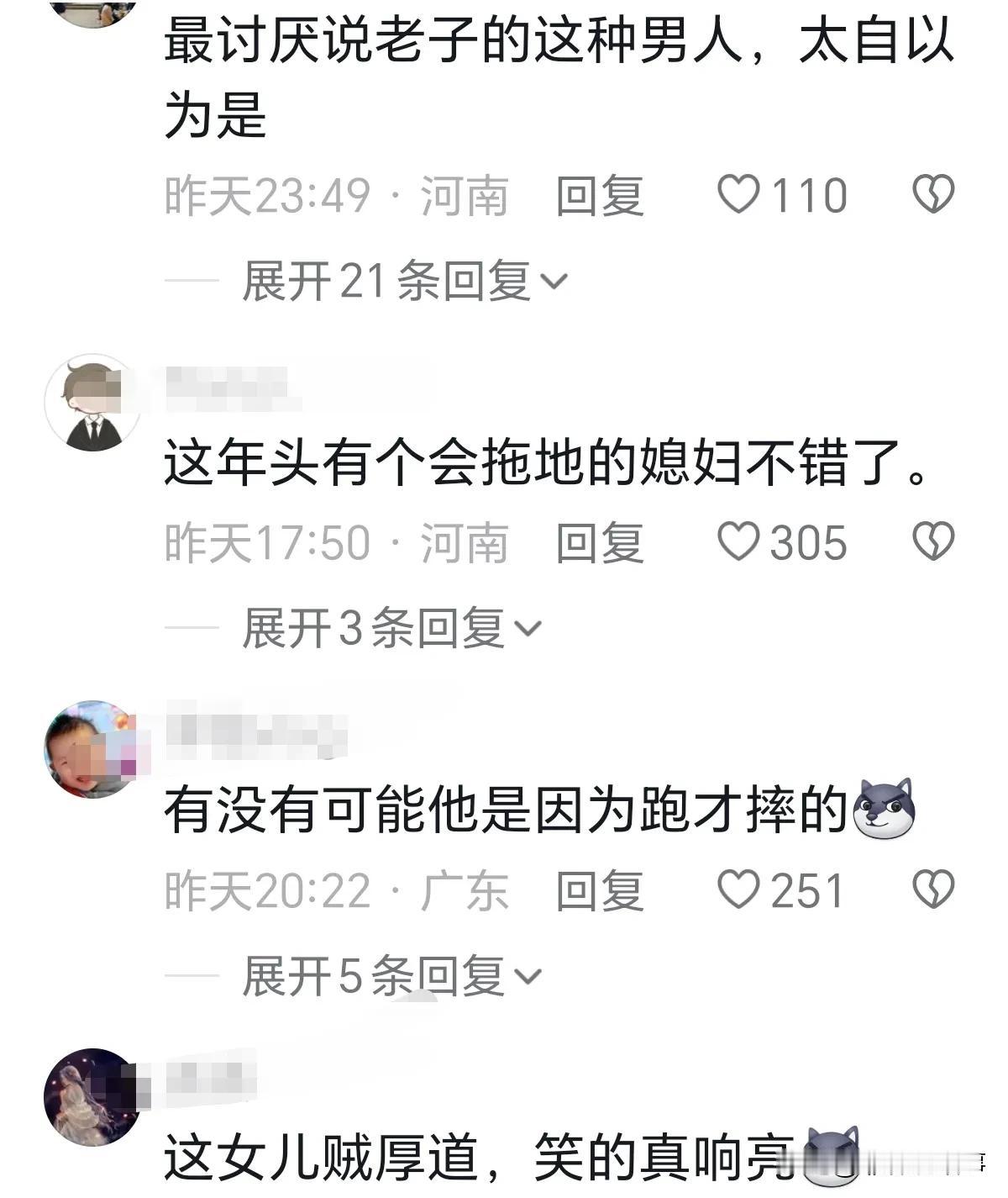一位丈夫在家中摔倒埋怨妻子晚上拖地。 丈夫:老子喊你莫拖地,每天都晚上拖地! 妻子:晚上不拖,那我什么时候拖啊? 丈夫:不是摔老子,就是摔女儿。 女儿:哈哈哈哈 网友:最讨厌说老子的这种男人,太自以为是。 网友:这年头有个会拖地的媳妇不错了。 网友:有没有可能他是因为跑才摔的。
