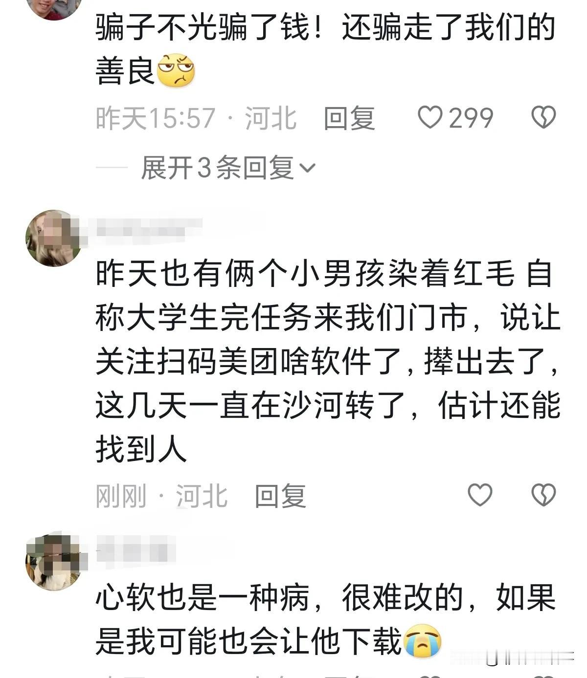 近日河北沙河市,一位美女遭遇新型诈骗,有两个小男孩骗她下载了某个app,说是完成工作任务,出于好心美女下载了这个app,四天后凌晨3点,自己的手机出现沙沙的声音,美女无法操控手机,手机自己操作,十几分钟后,美女银行卡里的2万元钱被转至境外,美女非常气愤,自己出于好心,当时两个男孩一直求她,说是有任务需要完成,美女觉得年轻人赚钱不容易,就帮忙了,并且说自己没有贪图小便宜,完全是出于好心,没有拿任何礼物,美女提醒大家小心这种利用善心的诈骗。 网友:骗子不光骗了钱!还骗走了我们的善良。 网友:昨天也有俩个小男孩染着红毛自称大学生完任务来我们门市,说让关注扫码美团啥软件了,撵出去了,这几天一直在沙河转了,估计还能找到人。 网友:心软也是一种病,很难改的,如果是我可能也会让他下载。
