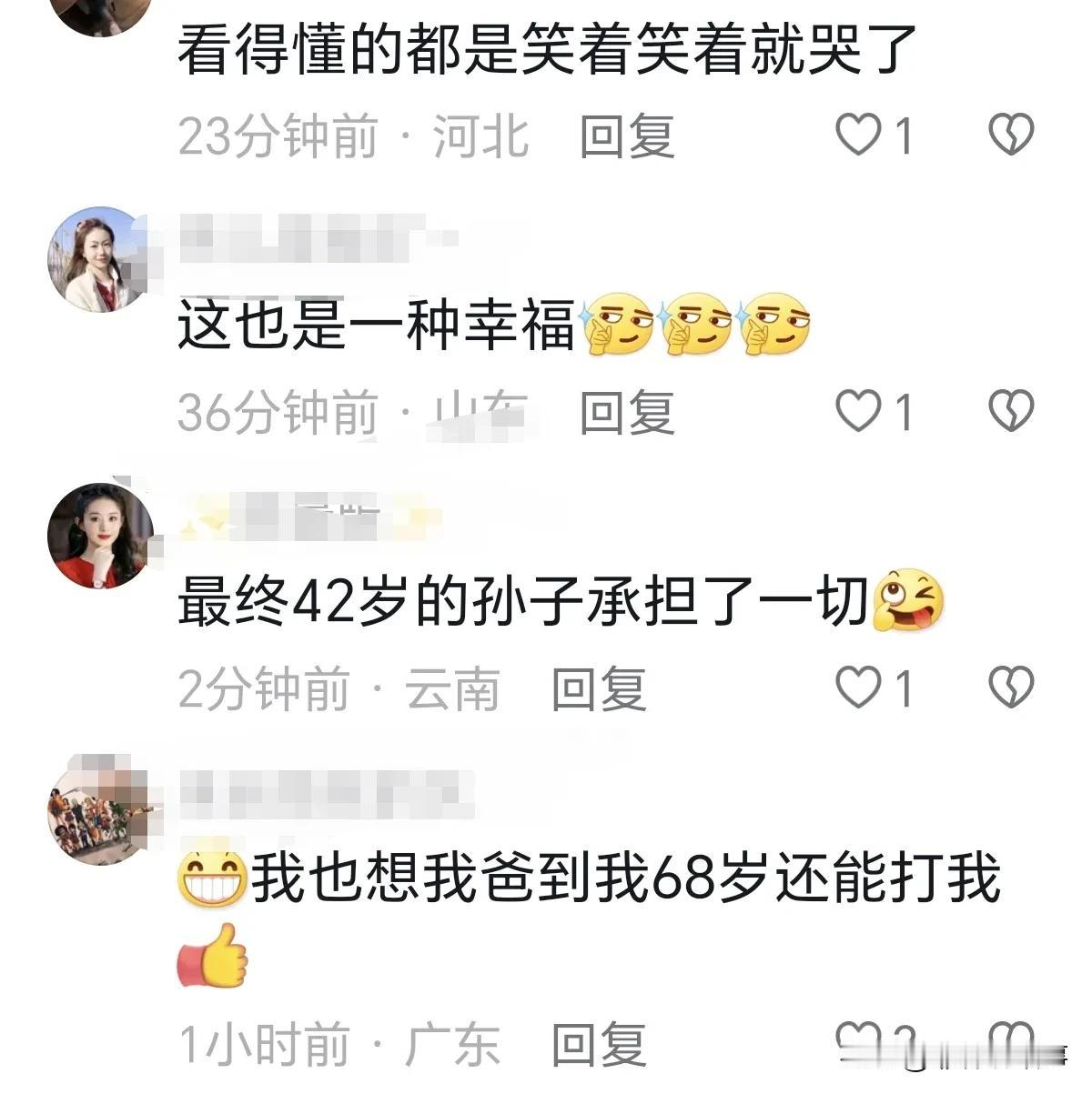68岁还有98岁的父亲教训,是多么幸福的一件事。 98岁爷爷生气的质问68岁的儿子,院里的树是不是你砍的? 68儿子:不是我伐的,不是我伐的。 98爸爸:不是你搞的?不是你搞的? 98岁爸爸要出去找家伙教育儿子,被旁边的人拦住了。 68儿子:是我干的行了吧[捂脸] 网友:最终42岁的孙子扛下了一切。