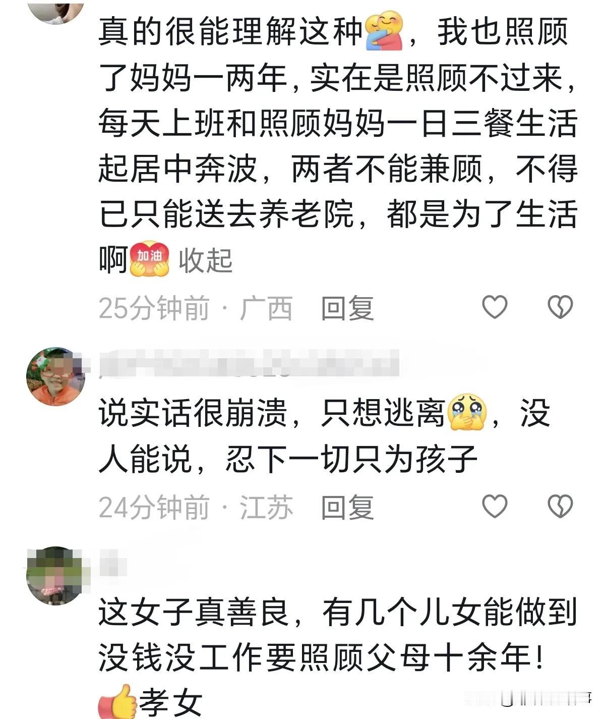90后年轻女子满面沧桑,照顾痴呆爸爸十余年,她的父亲时而清醒时而糊涂,无时无刻都需要人照顾,虽然她每天都在崩溃中渡过,但是她认为叫爸爸的时候,只要爸爸还能答应就是一种幸福,爸爸糊涂犯错的时候,她就打自己发泄,她说不这样自己发泄不出去。 网友:这个女儿也是善良的,有几个子女能做到没钱没工作照顾父母十余年?