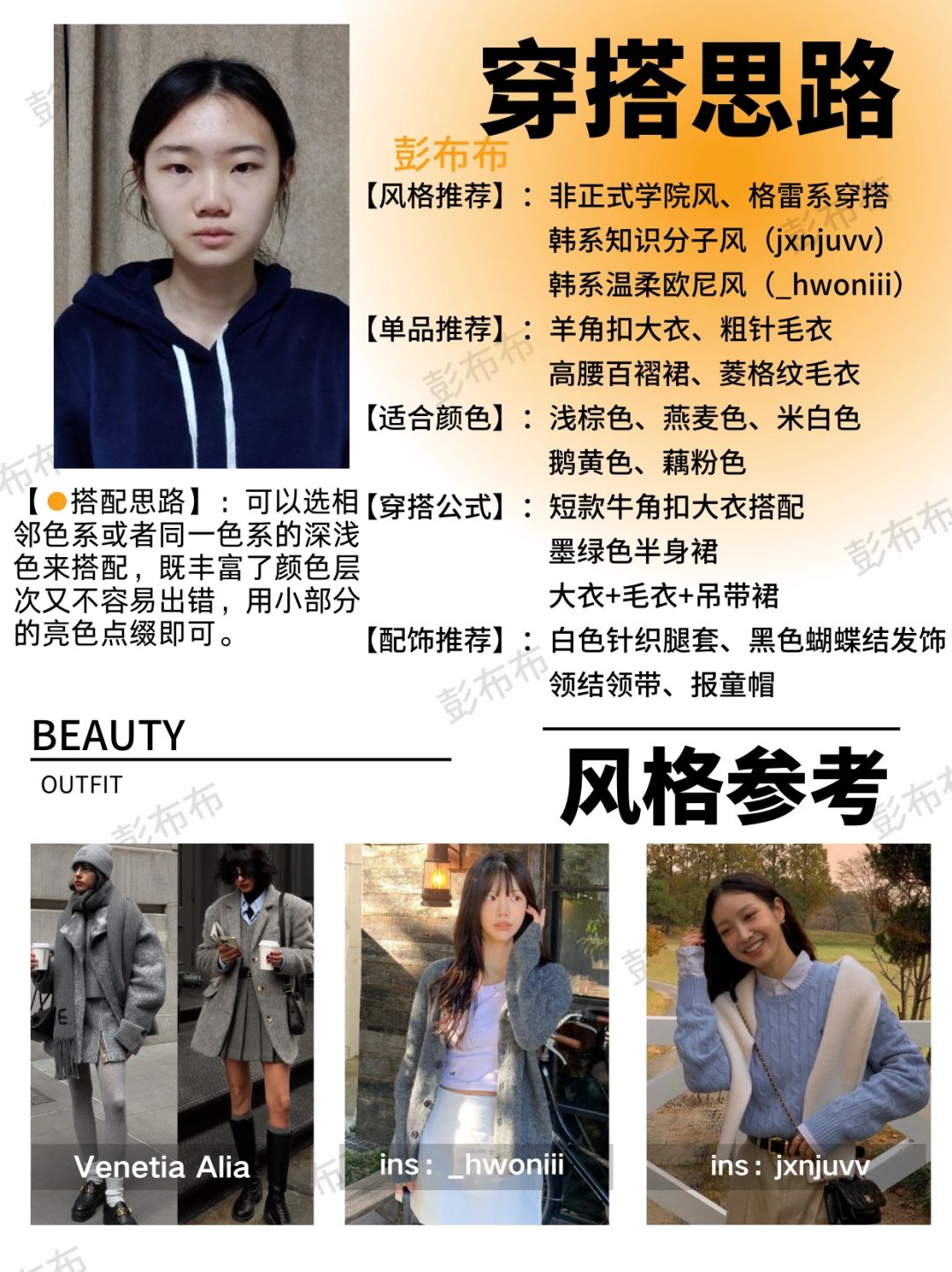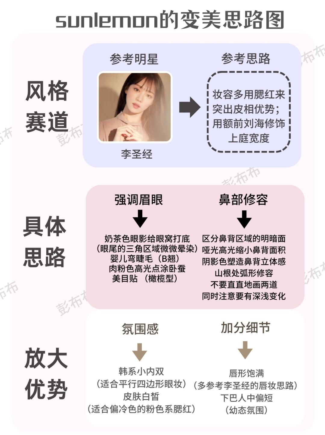 【低山根+窄双眼皮】为什么看起来很韩? 这期《布布粉丝看脸》分析的粉丝是一位窄双眼皮的韩系美女🥰,脸型是比较流畅的倒三角型脸,细看她和李圣经欧尼的脸型和五官比例有些相似,而且两个人都是高个子。就可以借鉴李圣经的思路,可甜可御的风格都很合适。利用额前刘海修饰上庭的宽度,视觉上改善山根偏低的问题。唇妆也是妆容不能忽略的部分,唇形上也可以参考李圣经的唇妆思路,薄涂镜面唇釉增加妆容亮点✨。 . 妆容💄:韩系伪素颜氧气妆、淡颜小白花妆容、元气眼镜妆、李圣经同款蜜桃妆 发型✂:李圣经同款额前刘海+直发披发、初恋刘海+韩系高层次锁骨发、短八字刘海+氛围感单侧低马尾 穿搭👗:非正式学院风、韩系知识分子风(jxnjuvv)、格雷系穿搭、韩系温柔欧尼风 (_hwoniii) . 如何打造画出唇形💄? . 1、基本思路🪄: 只要通过「调整明暗分界位置」就能调整唇形! 厚唇/薄唇:调整受光/背光分界线,可改变嘴唇厚薄🎗 唇珠、唇峰不明显,可以通过明暗对比来凸显! 2、 具体调整方法👇: ● 「厚唇」改薄:嘴唇边缘用遮瑕膏弱化边缘;唇部明暗交界线尽量内移,将上下唇的重心往内缩。内侧用深红色口红,外侧用浅色口红💗 ● 「薄唇」饱满:用遮瑕膏把嘴唇原本的唇线遮住,接着用唇刷沾取口红勾勒新轮廓;扩大的范围要适量,不能贪多,否则会显得不自然;最后用口红填色即可✅ ● 「唇峰不明显」:先用唇刷沾取口红,勾勒出唇峰的形状;沿着唇峰涂上高光,人中的两条也涂上高光,精致有形的Ⓜ唇立刻拥有! ● 「塑造立体唇珠」:上唇“U”形区域内涂浅色口红,或者涂上有光泽感的唇彩提亮;唇珠两边涂上深色口红,加强唇珠的立体感🆙;下唇唇珠下方涂上深色口红。 ● 「嘴角下垂」改善:上唇边缘“八”字遮瑕,让边缘往里凹,可以展现嘴角上扬的感觉;嘴角用深色口红斜向上扬,这样就拥有了微笑唇的弧度💖