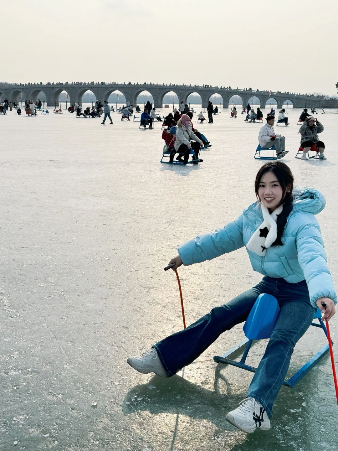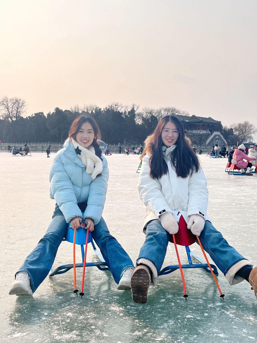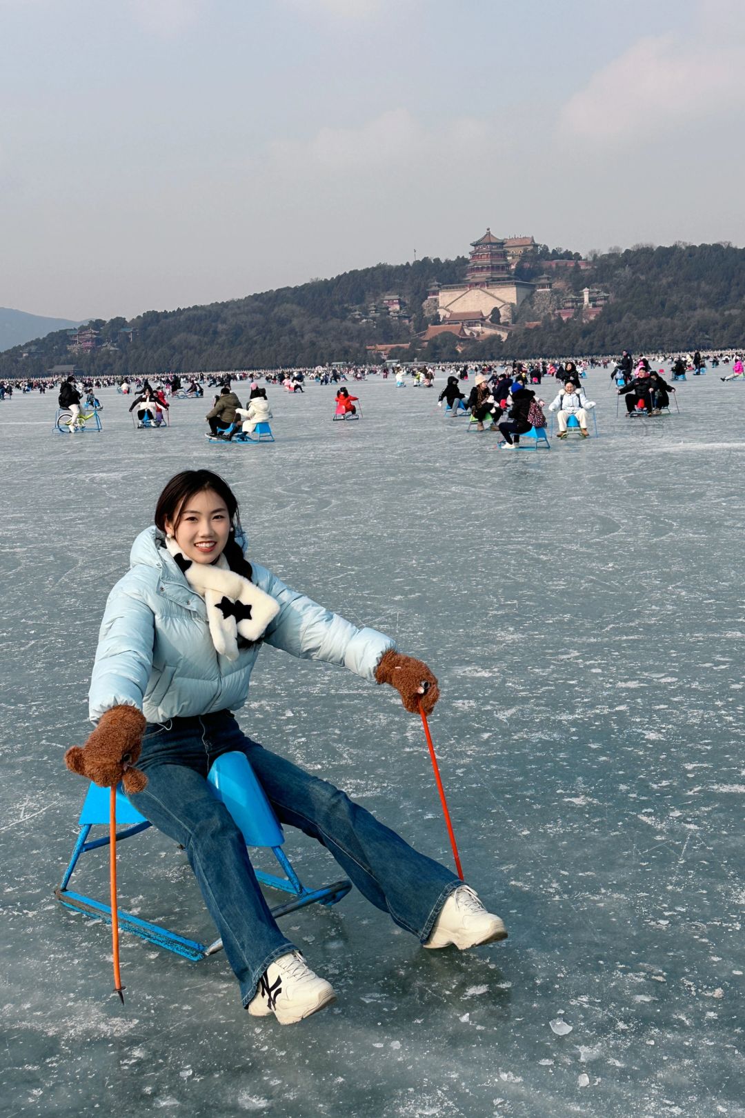 坏了,在颐和园滑冰好快乐! 第一次来颐和园滑冰,好快乐!! 大家记得提前在手机购票,直接进场,颐和园门票20,冰场单人车50(都可以搜小程序购票),中午12点半到没有排队! 离冰场最近的🚪是新建宫门,进门就是冰场入口 感觉没有大家说的那么冷,只要你一直在滑,还是挺热的,但是手套一定要带!!那个杆子好冰,车屁股也好冰,可以贴个暖宝宝