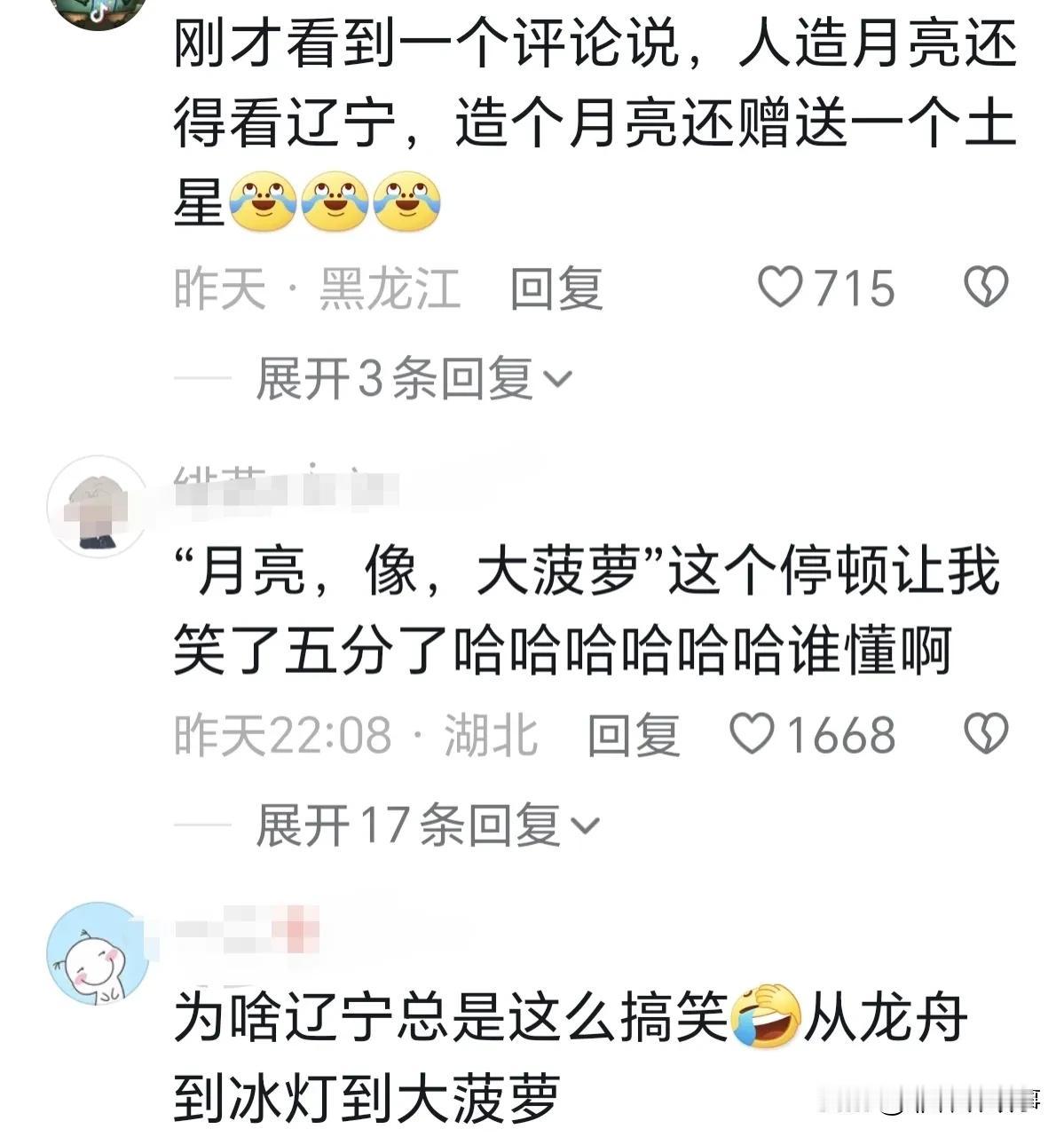 辽宁沈阳的人造月亮被吐槽像大菠萝,我感觉不如真的做成大菠萝,想想天上挂个大菠萝,或者大草莓的多有意思啊!其实沈阳的人造月亮很有自己的风格,不随波逐流,让人眼前一亮。 网友:刚才看到一个评论说,人造月亮还得看辽宁,造个月亮还赠送一个土星。 网友:“月亮,像,大菠萝”这个停顿让我笑了五分了哈哈哈哈哈哈谁懂啊! 网友:为啥辽宁总是这么搞笑 ,从龙舟到冰灯到大菠萝。
