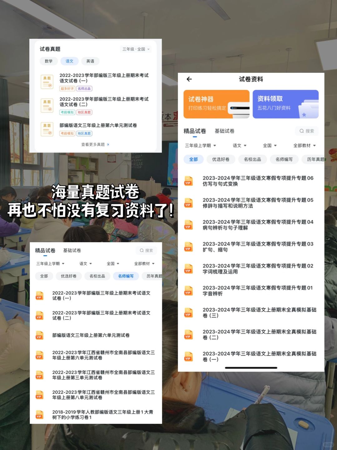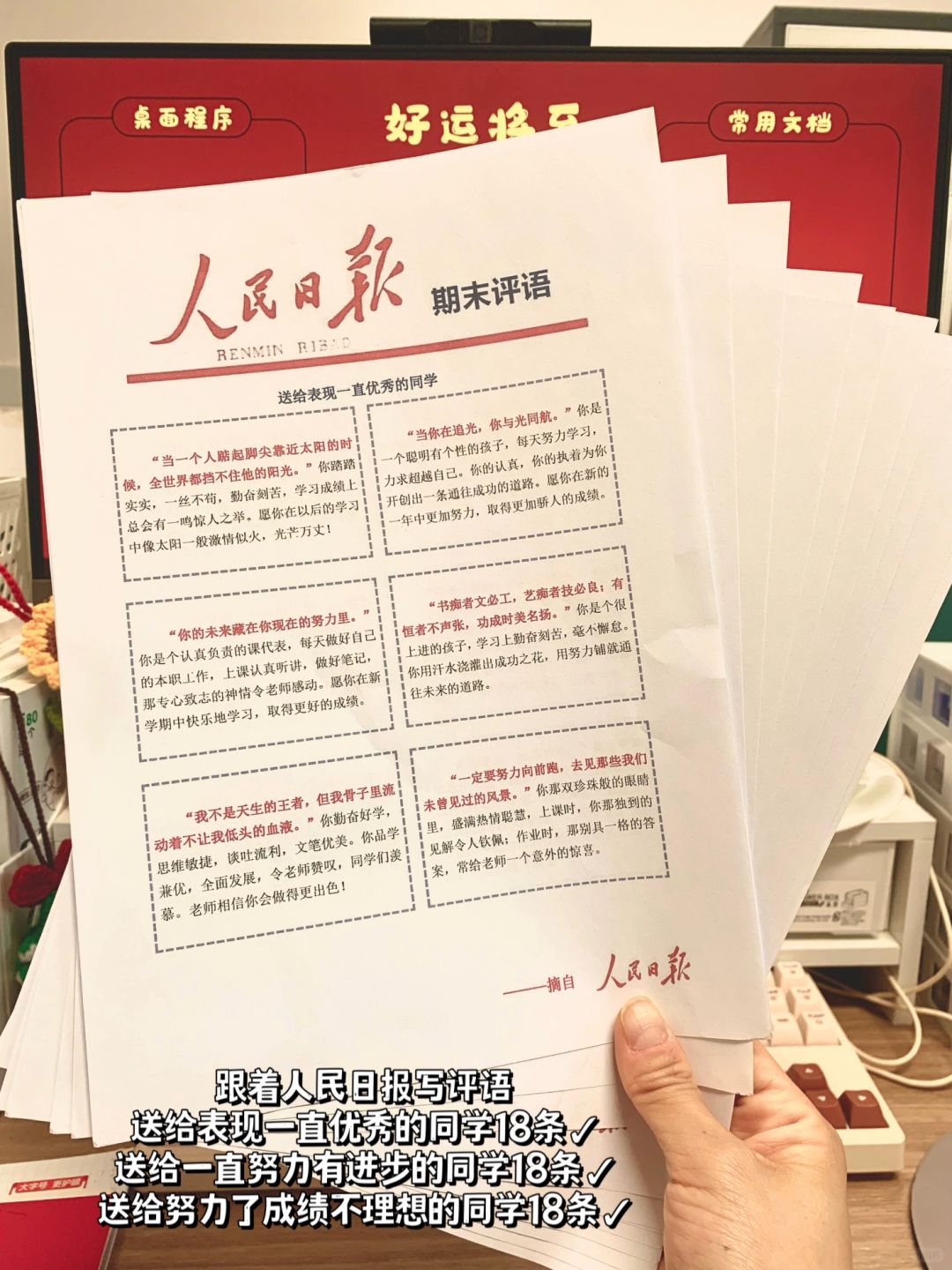 期末评语、复习试题一网打尽✅省心省力迎假期 期末季又到了!为大家整理了一些干货,老师们快快用起来吧~ 跟着人民日报写期末评语,哪个孩子看了不迷糊? 送给表现一直优秀的同学 18条 ✓ 送给一直在努力,有进步的同学 18条 ✓ 送给努力了,但成绩不理想的同学 18条 ✓ 送给没有努力的同学 18条 ✓ 期末复习没试题?蜜蜂试卷来帮你! 发现一个宝藏教师app:蜜蜂试卷 •它可以一键清除手写笔记,还原干净试卷,还可将试卷图片转为word文档,格式不变,可以直接编辑。 •拍照即可一键批改口算习题,解放数学老师双手。 •创建线上班级,可以完成线上布置作业、发布打卡、共享资料、检测班级学习情况,教师也可以在app内完成作业批改,错题汇总、组卷,对不同学生有针对的督促学习。 •更有海量真题试卷,期末复习再也不怕找不到复习资料啦! 期末复习没氛围?教室壁纸换起来! 制作了三款期末复习教室壁纸,换上分分钟营造学习氛围,我们学校老师们都在用~