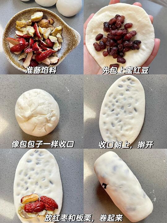4⃣️收口朝上,擀开,放红枣和板栗,卷起来