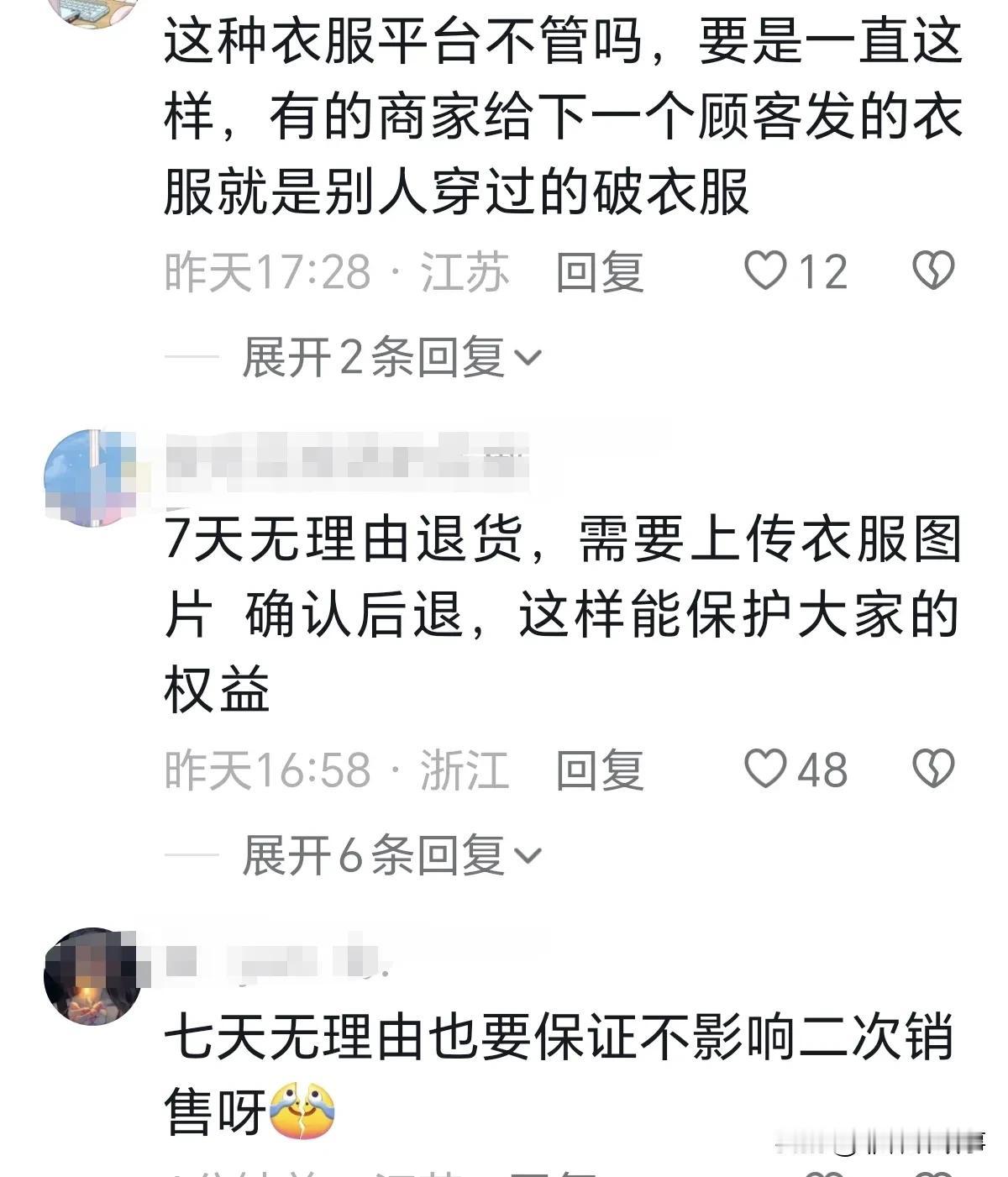 东北旅游火了之后,新一轮的退羽绒服热潮又来了,吊牌不摘袖口穿的全是黑泥,给人家老板退回去了,用的还是顺丰到付。 老板问:“为什么退”? 对方说:“太大了,别废话七天无理由退货”。 给老板气的羽绒服直接扔了,老板也是怪可怜的,遇到这种奇葩买家,商家的利益谁来保护?衣服类的商品是否应该改成3天无理由退换,真的不合适当天就退了,用不着7天时间。 网友:吓得不敢买羽绒服了。 网友:这种衣服平台不管吗,要是一直这样,有的商家给下一个顾客发的衣服就是别人穿过的破衣服。