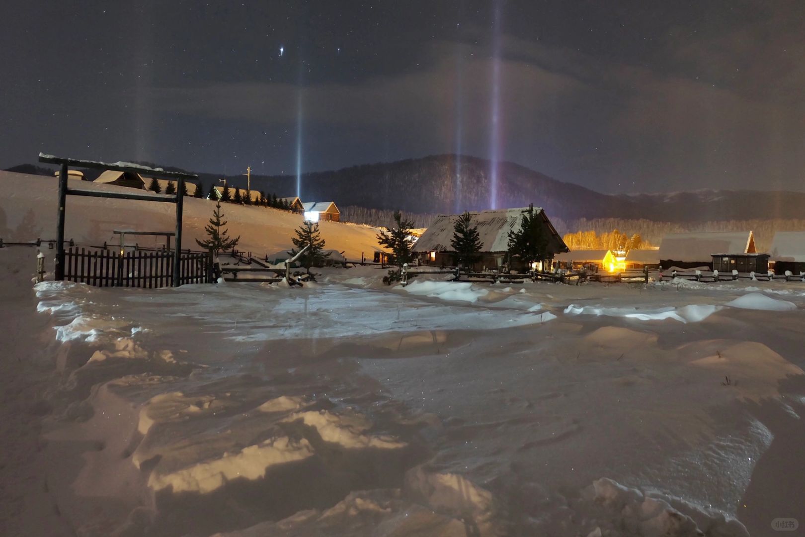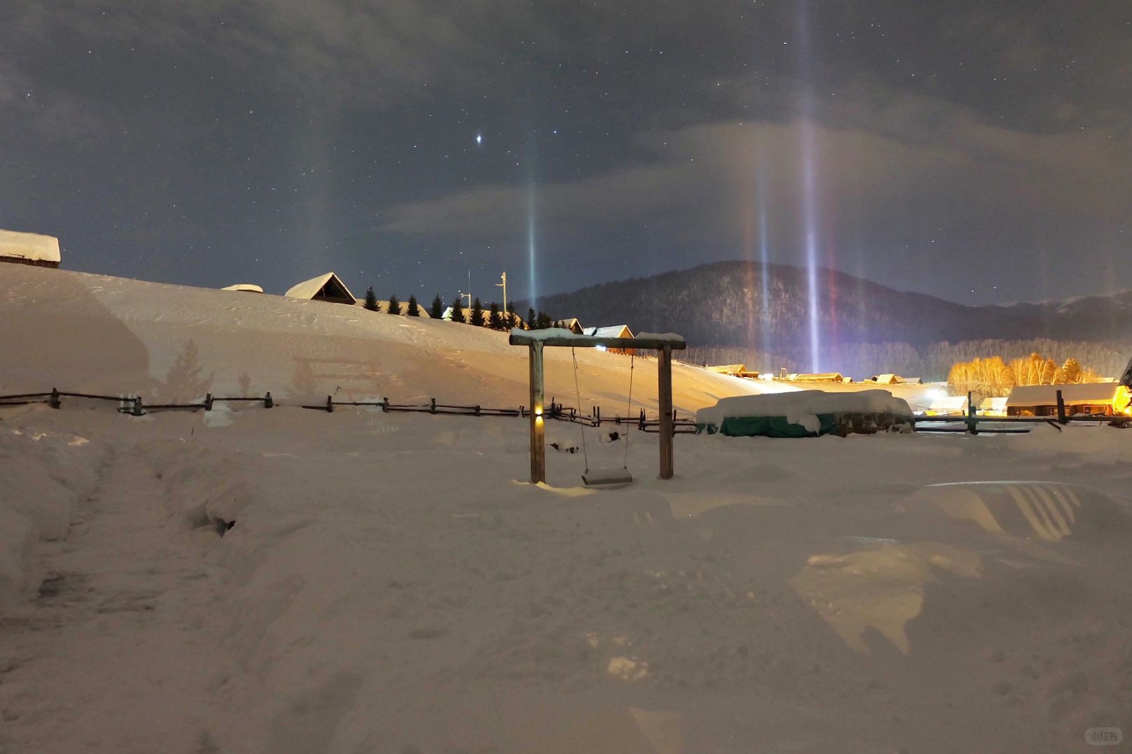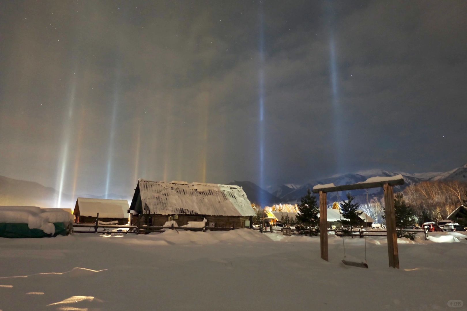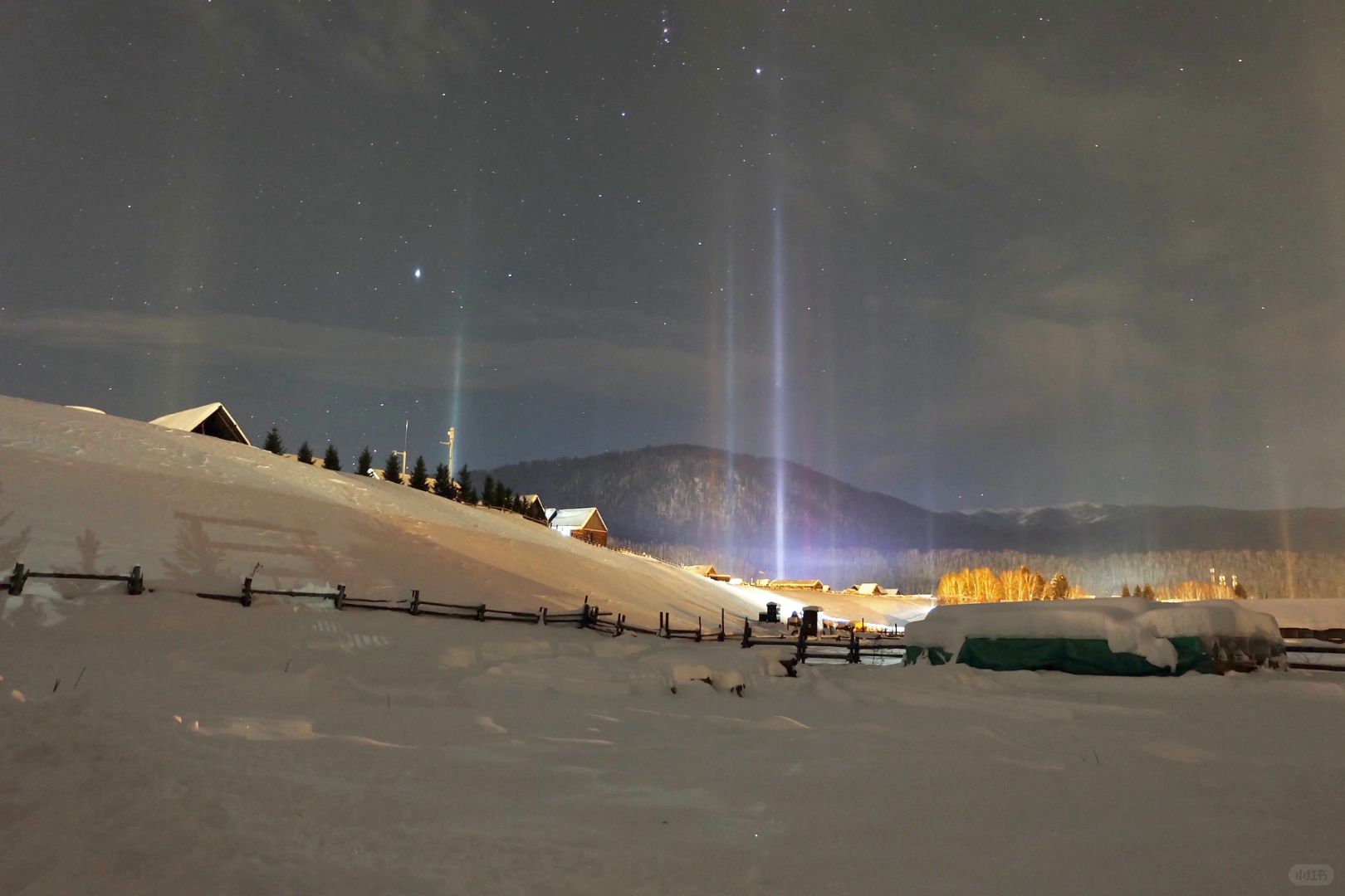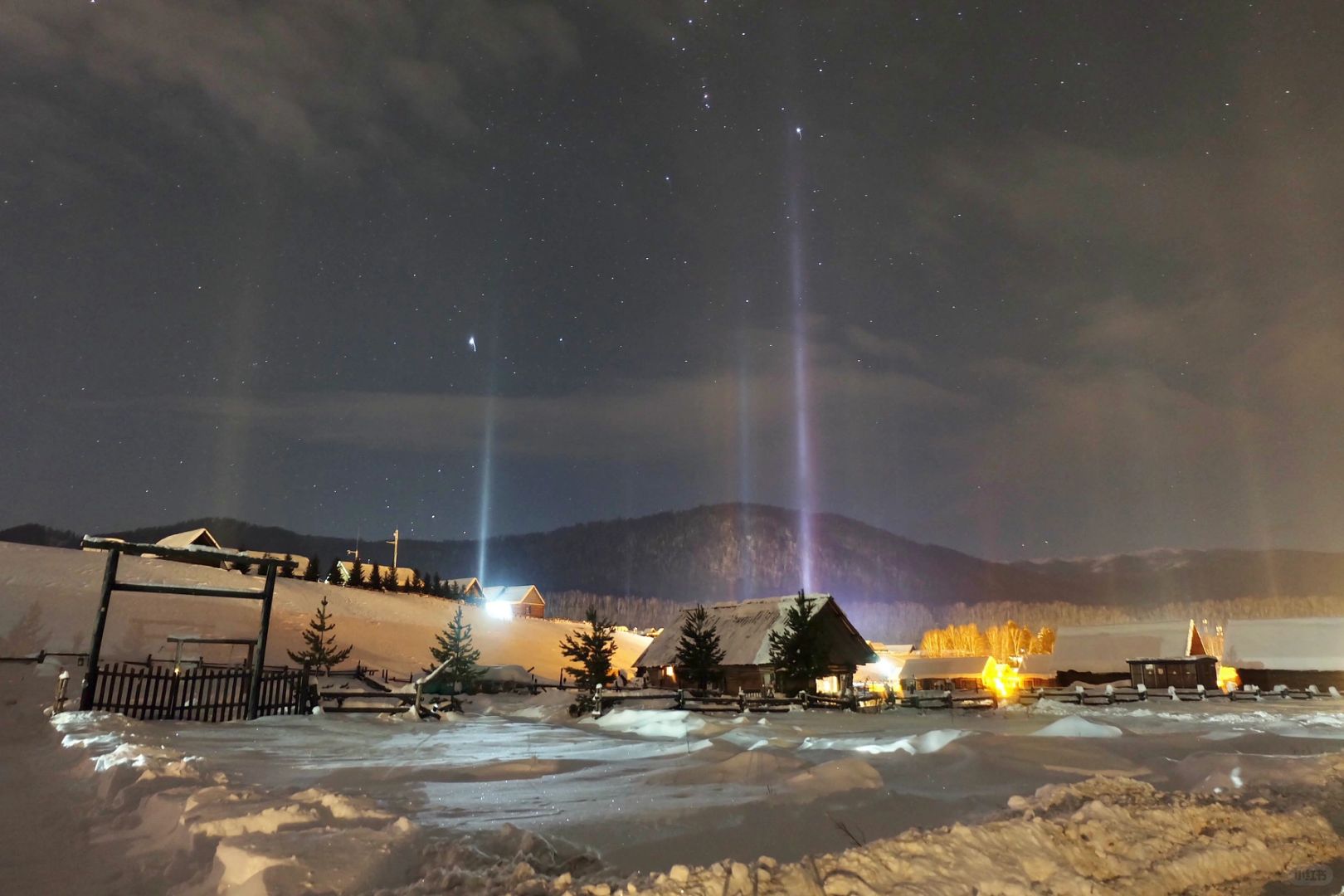 禾木惊现神秘光柱 我在阿勒泰看到了寒夜灯柱 错过了极光 在禾木看到了另在一种极寒景观 因大气中的冰晶反射灯光而形成 挺幸运的 手机长曝光就能拍到 肉眼很清晰
