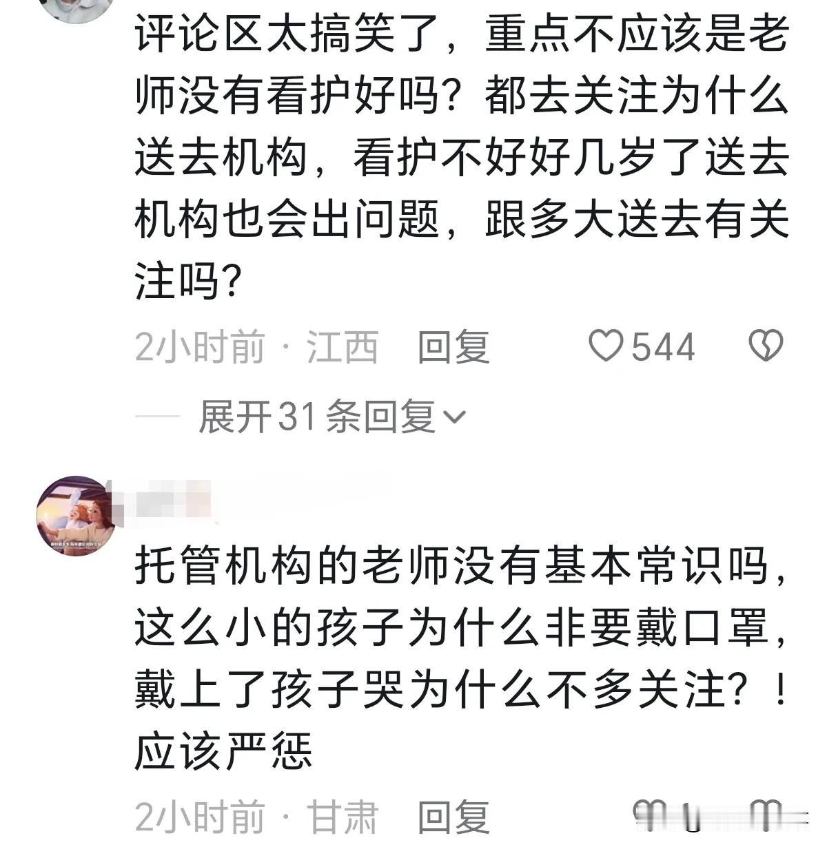 台湾11个月大的男婴,在公立托儿所被老师强制戴口罩,最终因为泪水浸湿口罩窒息死亡,婴儿父母一直想要孩子,通过8.9年努力才得到这个孩子,目前婴儿父母悲痛欲绝,以过失致死罪提告五名老师。 网友:评论区太搞笑了,重点不应该是老师没有看护好吗?都去关注为什么送去机构? 网友:托管机构的老师没有基本常识吗,这么小的孩子为什么非要戴口罩,戴上了孩子哭,为什么不多关注?应该严惩。
