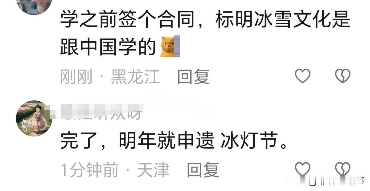 韩国看到哈尔滨冰灯文化火了,认为哈尔滨冰灯文化非常优秀,所以想要和哈尔滨合作,把冰灯文化引入韩国,还会带着工人去现场学习。 网友:学之前签个合同,标明冰雪文化是跟中国学的。 网友:完了,明年就申遗冰灯节。