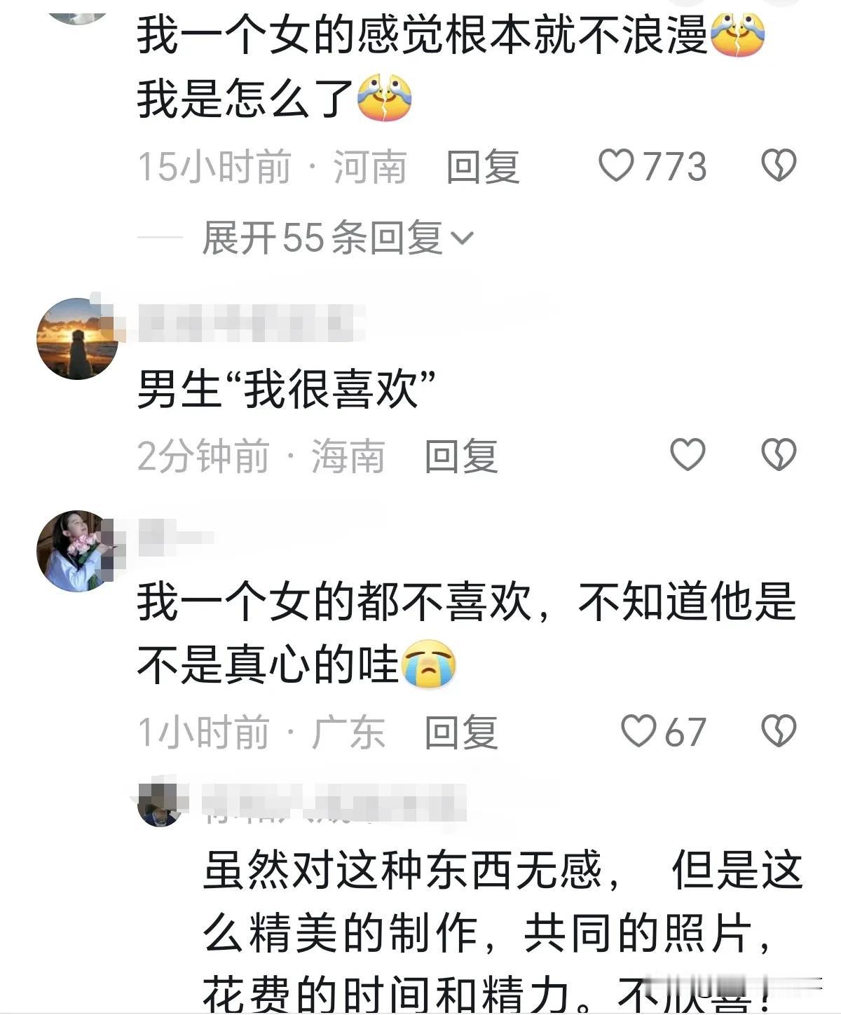 浙江女孩花两个月时间,做了一本和男朋友的照片相册,送给了男友,男友喜欢的不停哇哇大叫,根本停不下来,但是网友都说男孩是装的喜欢,没有男人会喜欢这种手工品,会觉得没有用扔一边。 网友:我一个女的感觉根本就不浪漫我是怎么了 网友:男生“我很喜欢” 网友:我一个女的都不喜欢,不知道他是不是真心的哇。 网友:虽然对这种东西无感,但是这么精美的制作,共同的照片,花费的时间和精力,不欣喜?