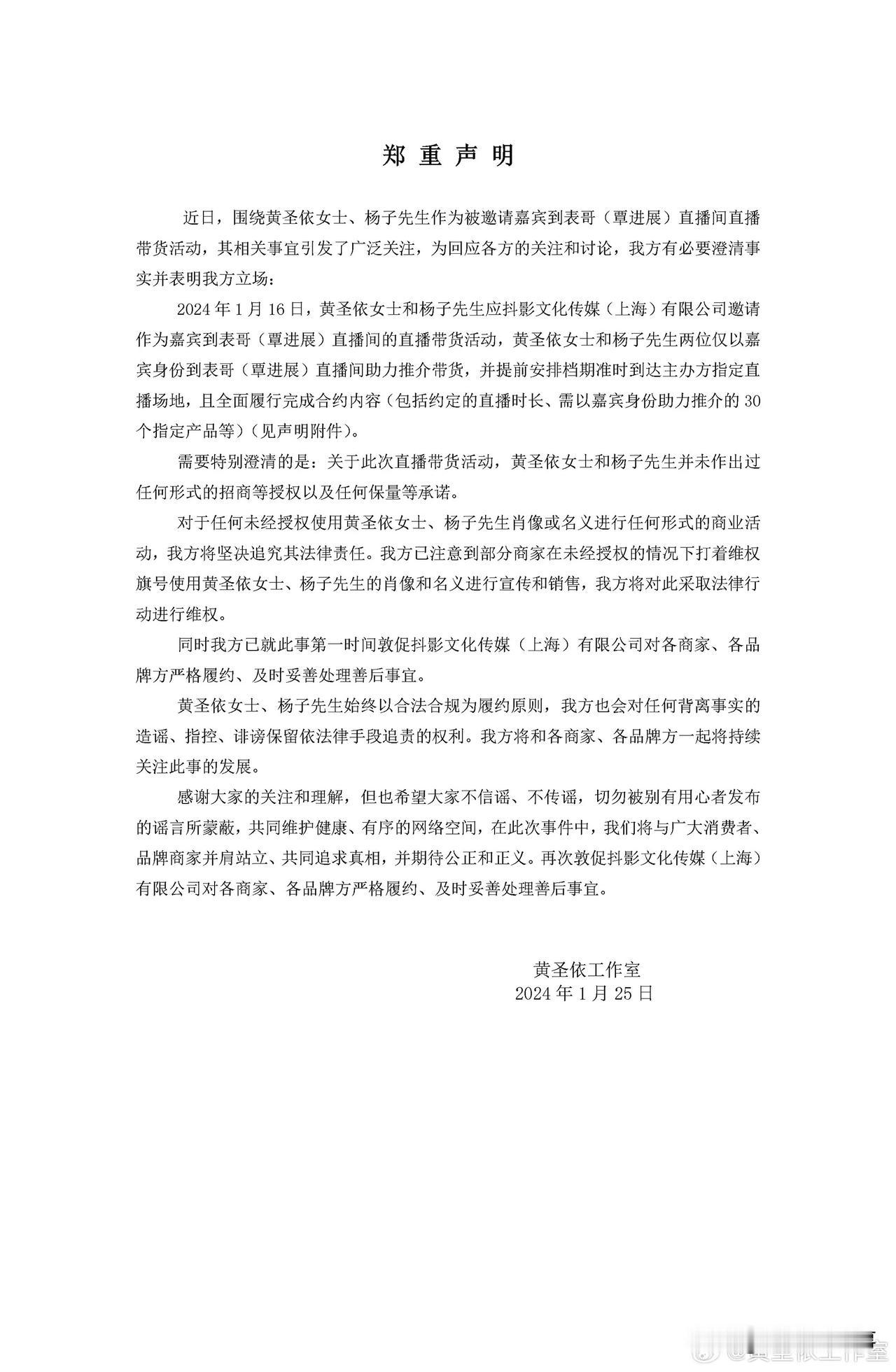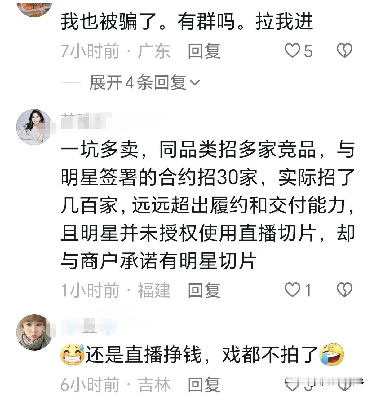 杨子黄圣依夫妇带货170万元腊肉只卖出去一单,71个商家支付了3000多万元的服务费用,好妈妈影视公司拒绝退款,商家认为该公司涉嫌合同诈骗,销售量没有达到最低销售额。 黄圣依工作室发声明:黄圣依女士和杨子先生并未作出过任何形式的招商等授权以及任何保量等承诺。 对于任何未经授权使用黄圣依女士、杨子先生肖像或名义进行任何形式的商业活动,我方将坚决追究其法律责任。 网友:还是直播赚钱戏都不拍了。 网友:一坑多卖,同品类招多家竞品,与明星签署的合约招30家,实际招了几百家,远远超出履约和交付能力,且明星并未授权使用直播切片,却与商户承诺有明星切片。