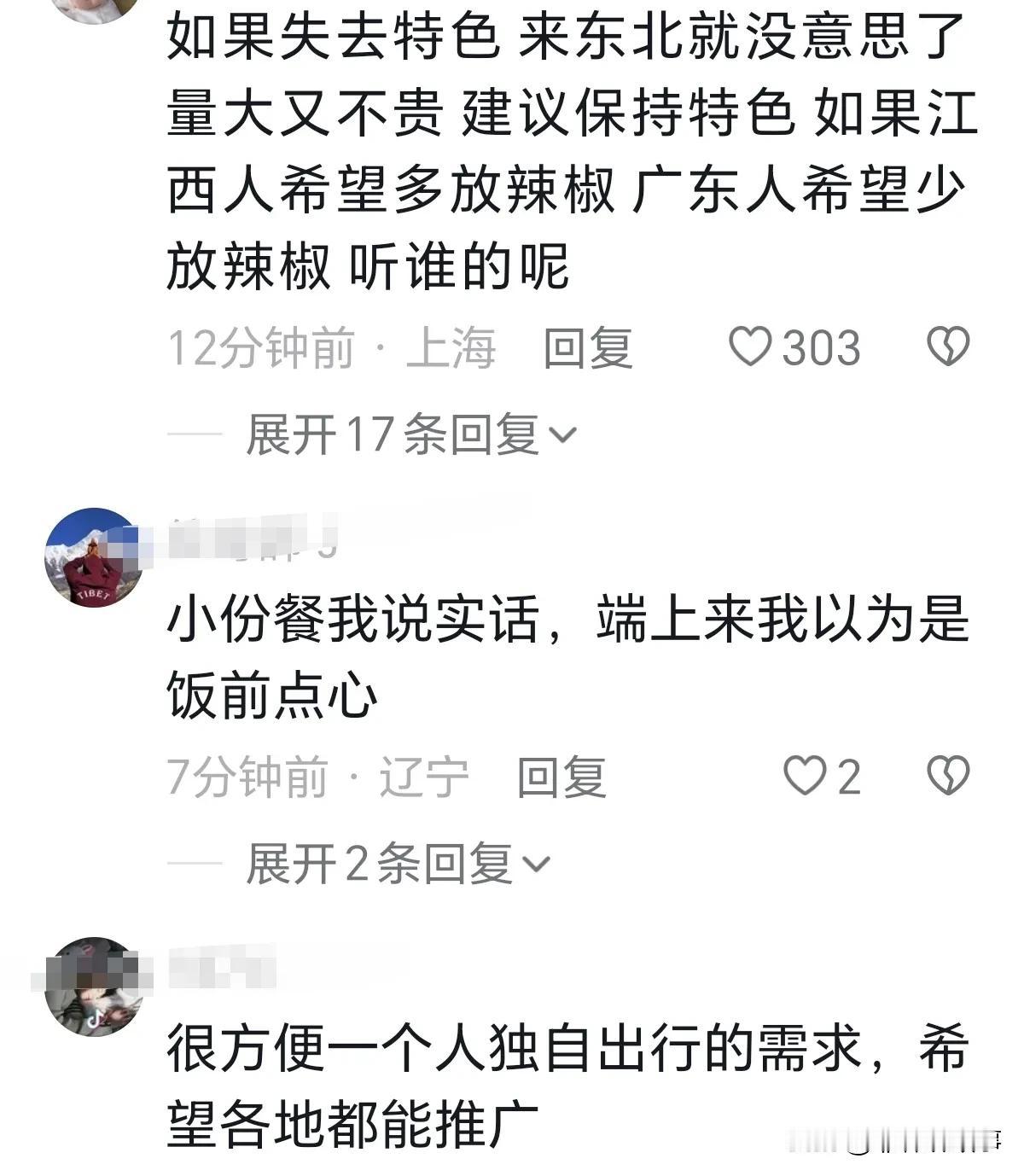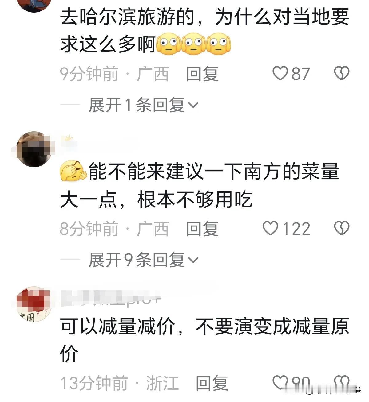 南方游客到东北,希望菜码小一点,能有适合南方人吃的小份菜。 黑龙江商务厅:将指导各地主管部门,督促餐饮经营单位,主动提供小份餐和餐后打包等服务,杜绝诱导超量点餐行为,提前告知游客菜码大小。 网友:去哈尔滨旅游的人,为什么那么多要求呢?南方菜码那么小那么贵,为什么提了多年的意见,也没人管,还是又贵又小吃不饱呢?东北菜已经很便宜了,要求小码价格再降低,商家怎么盈利? 网友:小份菜适合一个人旅行的,希望各地推广起来。 网友:可以减量减价,但是不要原价菜码变小。 网友:去旅游的,大码打包回去谁还吃啊!出小码是应该的。 网友:游客才呆几天啊!改变菜码,那当地老百姓呢?人家的用餐习惯,要为只来几天的游客而改变?以后菜码都变小码?南方的码那么小也没为北方游客变大码啊!大码就是人家的特色,入乡随俗不好吗?