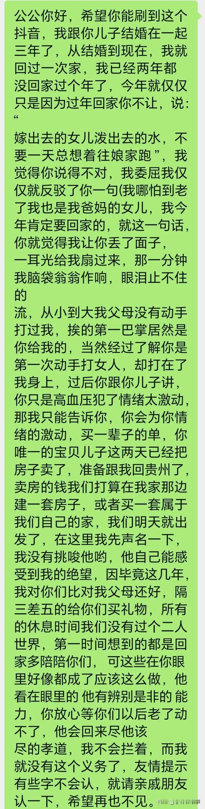 远嫁你后悔了吗?贵州远嫁安徽女子,因为三年只回过一次娘家,今年过年说想和老公回娘家过,被公公扇耳光,扇哭了。 公公:“嫁出去的女儿泼出去的水,别想着总往娘家跑”。 儿媳妇:“我哪怕到老了,我也是父母的女儿,今年我肯定要回家”。 因为公公觉得儿媳妇反驳他了,他没有面子了,上来就给儿媳妇一耳光,给儿媳妇打哭了,公公这一巴掌直接把家给打散了,儿子认为父亲做的很过分,和媳妇把安徽房子卖了,开车1600公里回了媳妇老家贵州,决定定居贵州,儿媳妇说:“这些年对公婆比对父母都好,隔三差五买礼物去照顾,都没有二人世界,一切的好都被当成理所应当,从小父母都没打过自己,我没有挑拨你们父子,你儿子是成年人有自己的判断,他懂得道理,你们病了你儿子会来照顾你们,我不会拦着,但是我没有义务照顾你们,从此希望再也不见”。#你后悔远嫁吗?# 网友:2024第一位大女主和正常老公出现了,感谢你老公给你的底气[赞]。