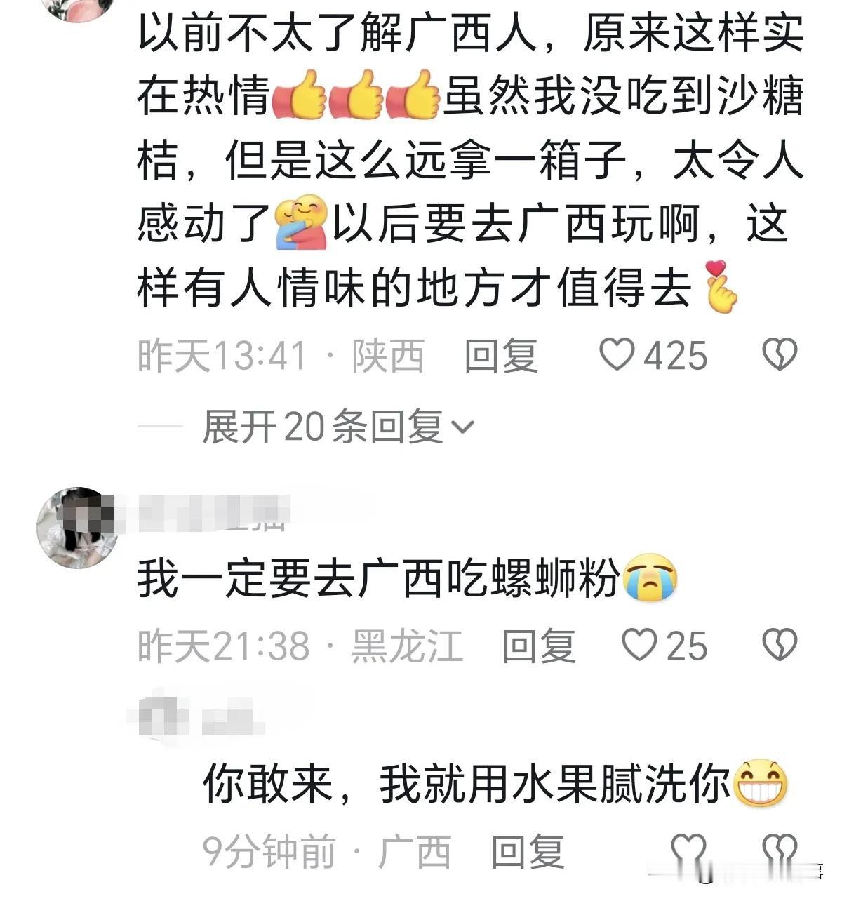 近日哈尔滨,广西游客真的是太热情了,来哈尔滨旅游,还带了一箱砂糖橘,就为了分享给哈尔滨有缘的老铁们,这份情意很重,相信接过砂糖橘的朋友们,都感觉到非常的温暖,还会掏兜看看有没有什么能够回礼的,以前真的没接触过广西人,广西人好有人情味啊! 黑龙江网友:我一定要去广西吃螺蛳粉。 广西网友:我就用水果腻洗你。