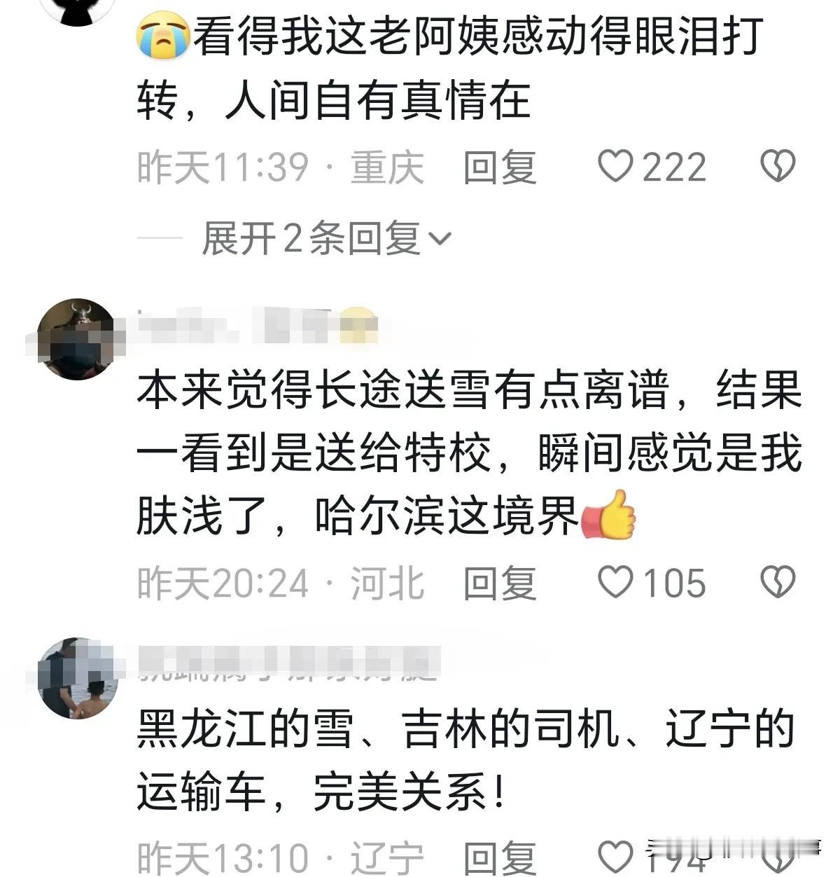 哈尔滨给广州送三大卡车雪还有冻梨这件事,开始不少网友觉得尔滨很离谱在炒作,直到知道尔滨这三大卡车雪和冻梨是送给广州自闭症学校的,很多网友都瞬间觉得自己肤浅了,尔滨确实是有境界的。 网友:看得我这个老阿姨,眼泪打转,人间自有真情在。 网友:黑龙江人真的很好,哪里有灾有难少不了,尔滨是一个有文化底蕴有情怀真情在的城市。
