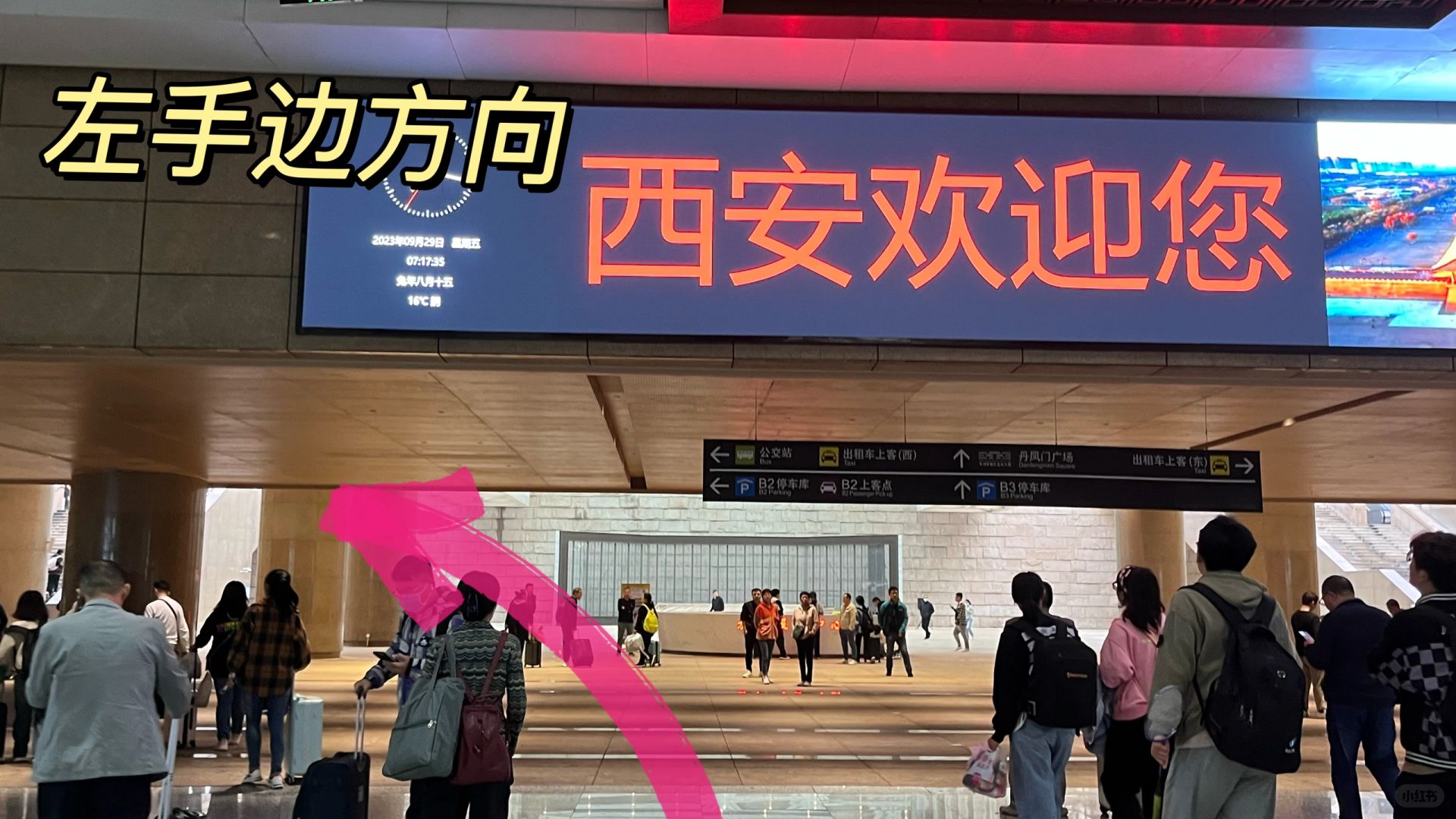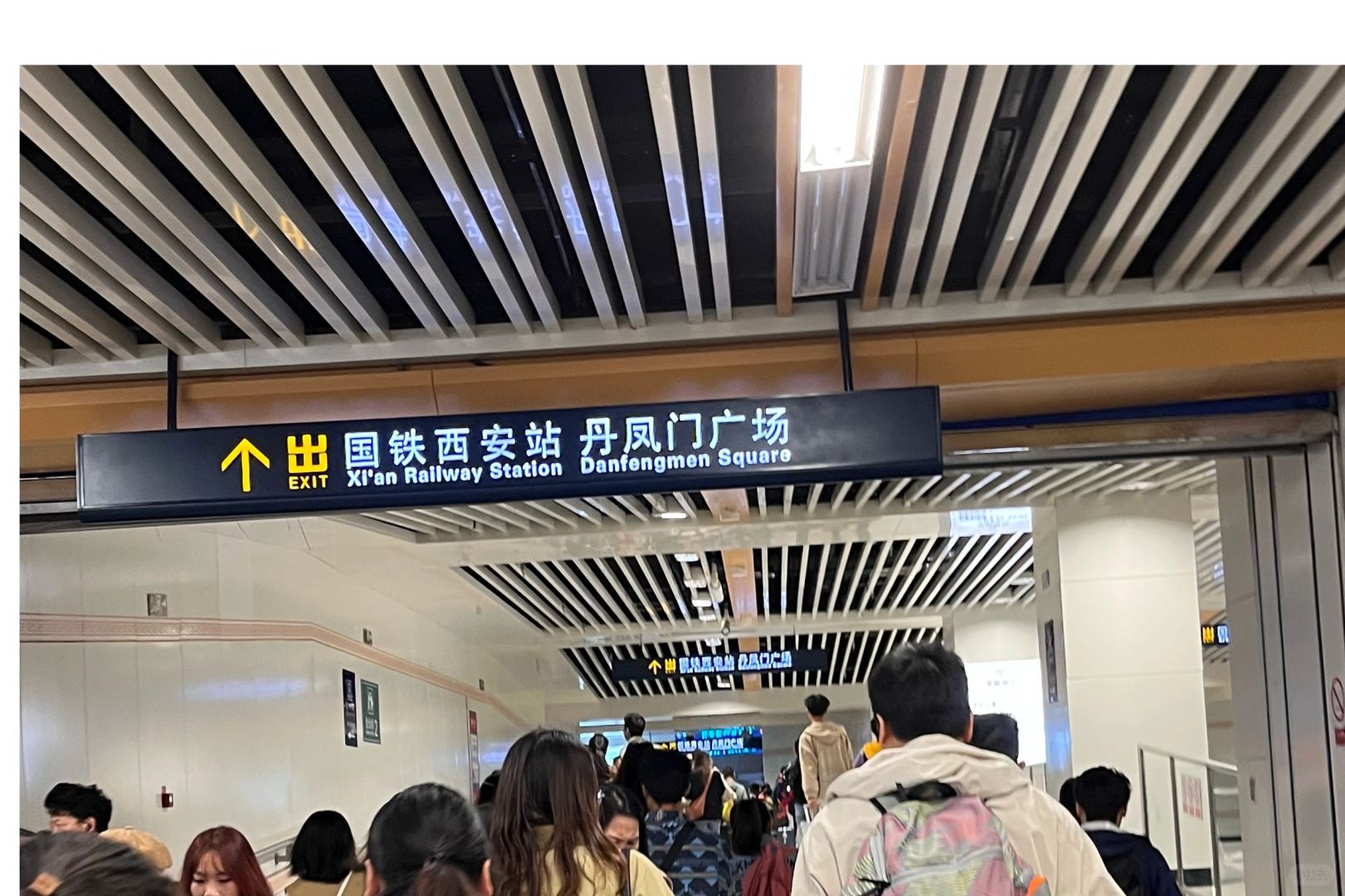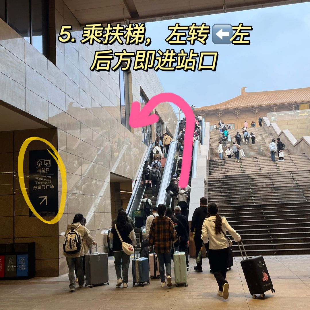 1. 出地铁后,上长扶梯,然后右转; 2. 走丹凤门广场出口(右手边) , ❗️可以看到两处地铁闸机出口,分别为正前方和右前方,哪个人少排哪个; 3. 看到进站口直接进站, ⚠️如果此门没开也不要慌张,继续直行,会依次看到行李寄存点和周黑鸭 ; 4. 然后右转,走北广场 进站口 ; 5. 走到头会看到向地面的扶梯,乘左侧扶梯上去,再往左后方走,就会看到西安站进站口,排队进站即可。