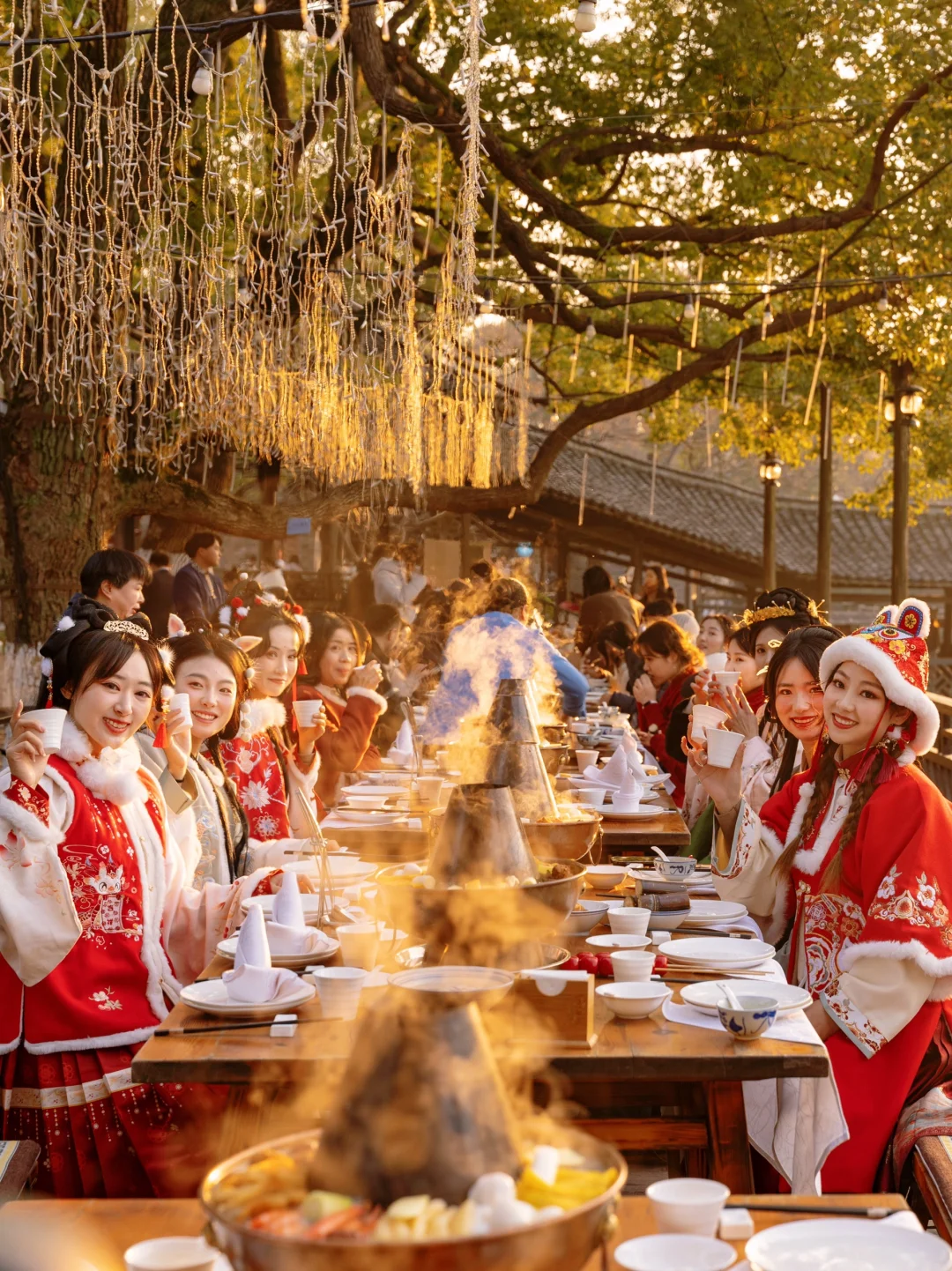 围着长桌吃热腾腾的紫铜火锅,喝一碗锅巴茶