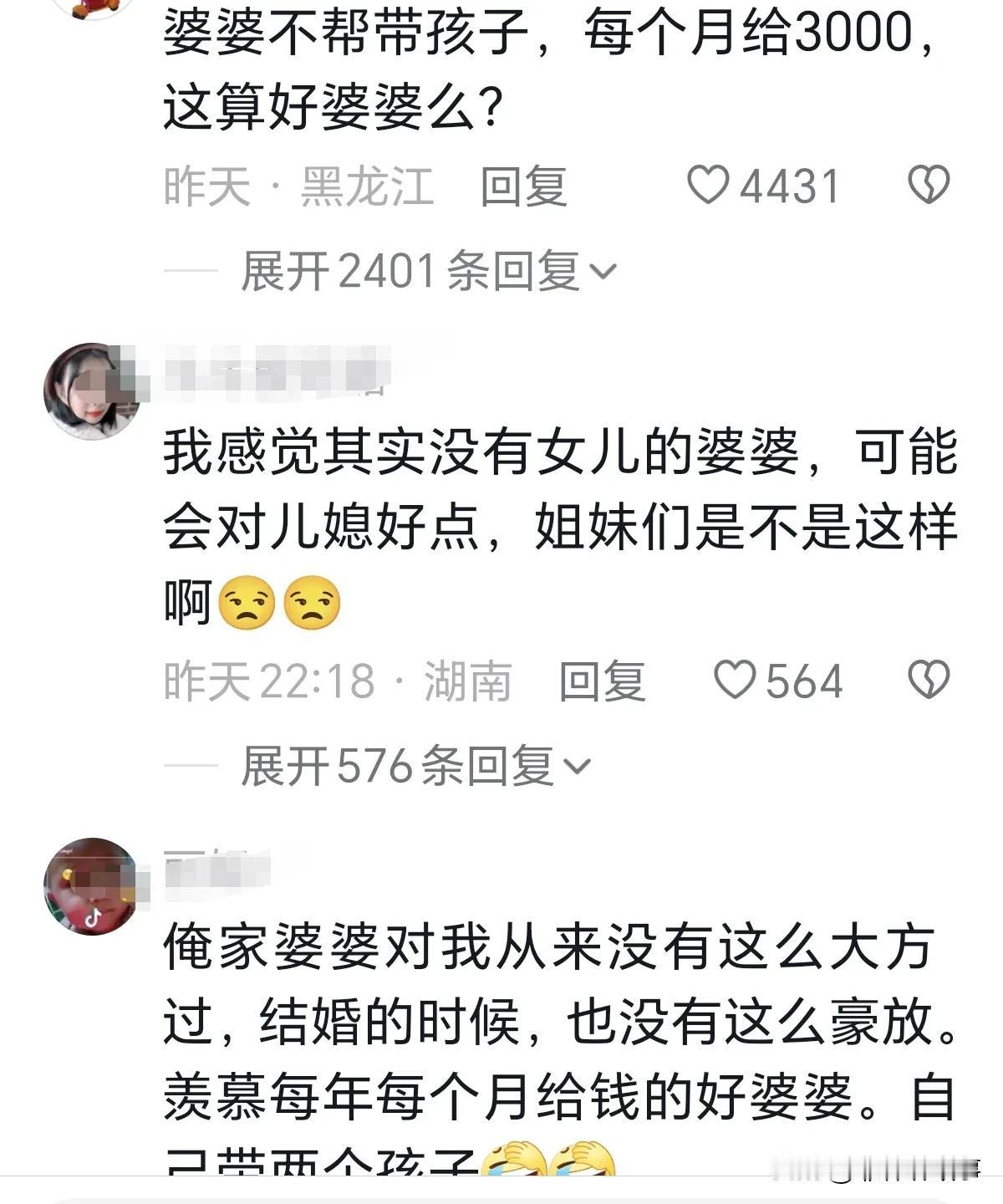 上哪找这么好的婆婆?年底在外务工的婆婆回来了,第一件事是给儿媳妇发工资压岁钱,一发就是3万,五千给媳妇父母,五千给孙女交学费,剩下两万奖励儿媳妇。 网友:婆婆也不容易,这钱换了我不好意思要。 网友:婆婆不帮我带孩子,每个月给3000,这算好婆婆么? 网友:俺家婆婆对我从来没有这么大方过,结婚的时候,也没有这么豪放,羡慕每年每个月给钱的好婆婆,自己带两个孩子。