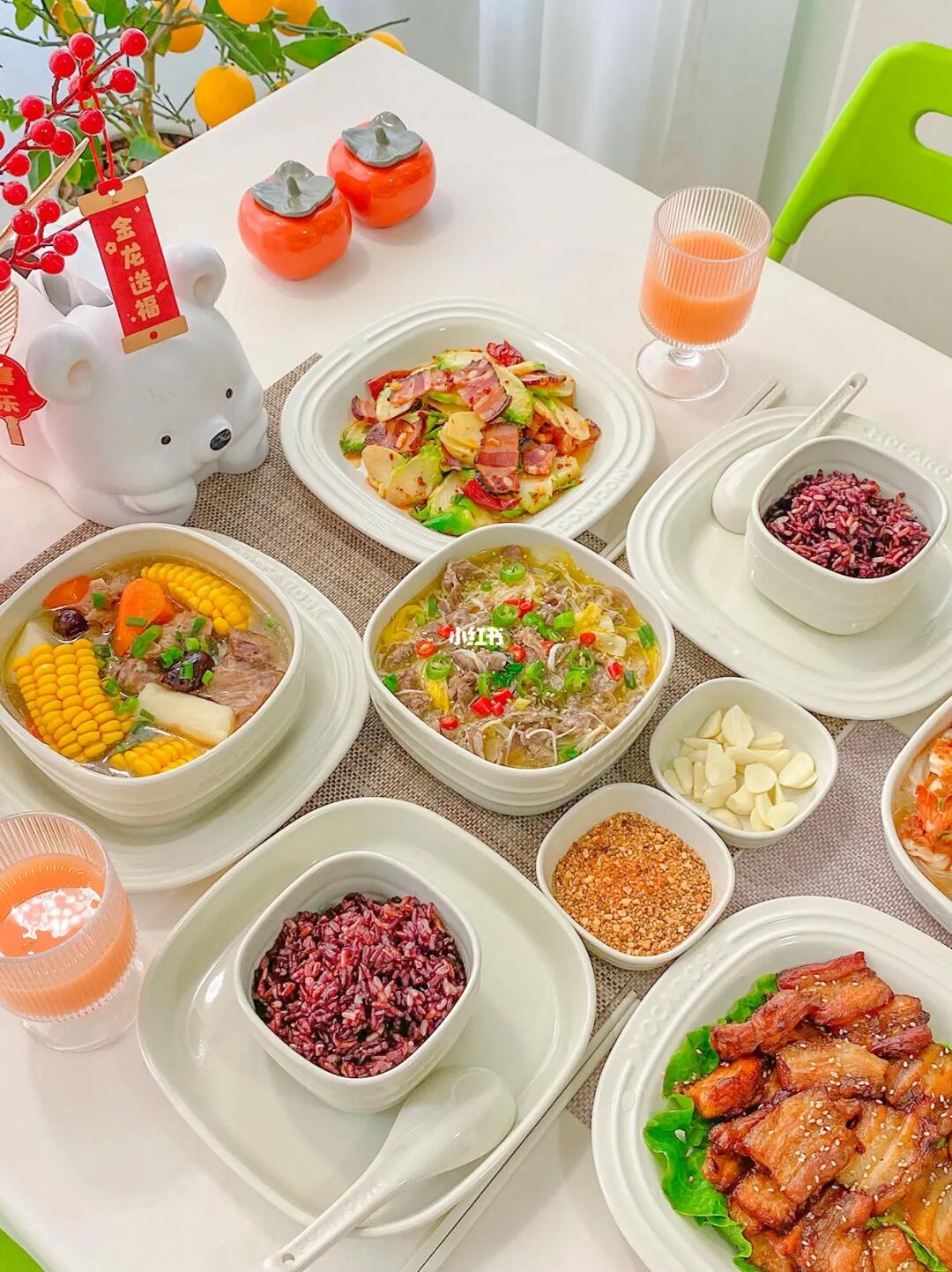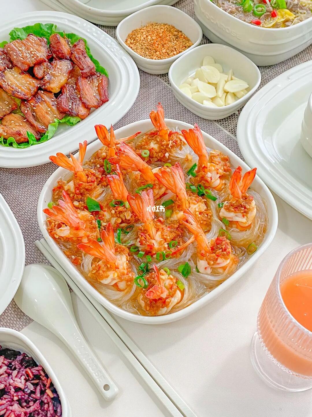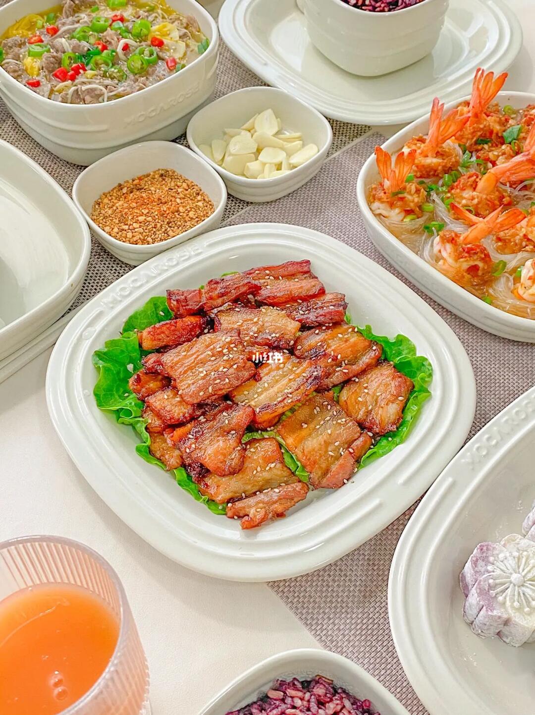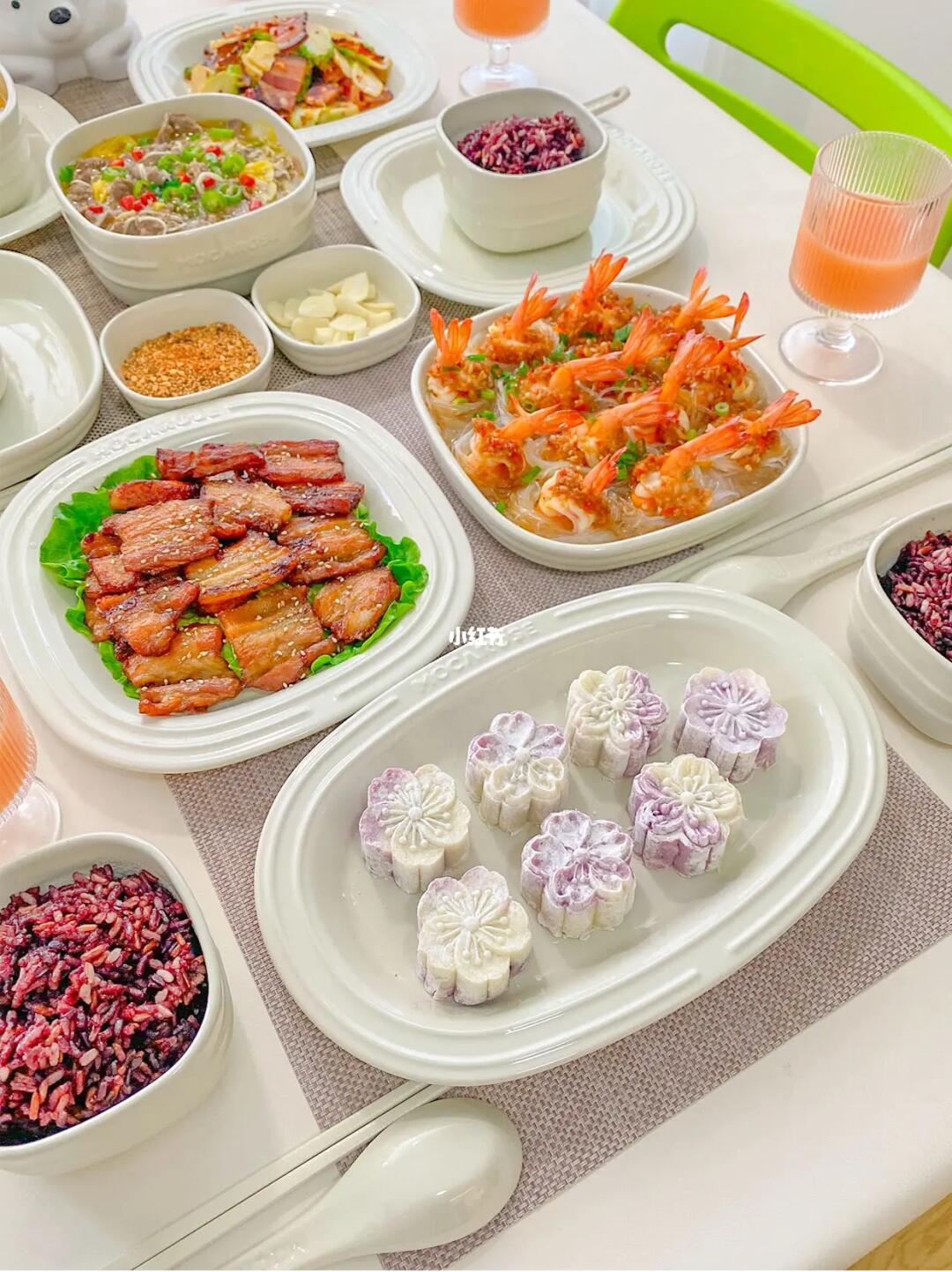 zui好的友情是各自忙乱,互相牵挂,今天的美好从朋友聚餐开始,别人都是宝藏女孩,我们是吃完,又饱又胀的饱胀女孩~哈哈哈哈[大笑R]配上新入的方形餐具,简约的奶白色,不挑菜色🍲,盛装菜肴让人眼前一亮✨。 今日菜单🥣: 1⃣ 蒜蓉粉丝虾 2⃣ 烤五花肉 3⃣ 酸汤肥牛 4⃣ 腊肉炒儿菜 5⃣ 玉米排骨汤 6⃣ 山药紫薯糕 菜品做法见图片~ 碎碎念🌈: 烤五花肉简单又好吃,有手就会系列,先用生抽蚝油盐入个底味,吃的时候蘸上干料,裹上蒜片、生菜,真的很绝,十颗星🌟推荐,五花肉最好选慢养黑猪的。 山药紫薯糕,大小朋友都爱系列,喜欢甜的,揉面环节可以多放炼乳、糖霜,也可以做好了淋果酱,如果吃起来有干粉的味道,可以蒸一下。铺在小烤盘上,食物铺得更开,烤箱受热也会更均匀,熟的也更快~