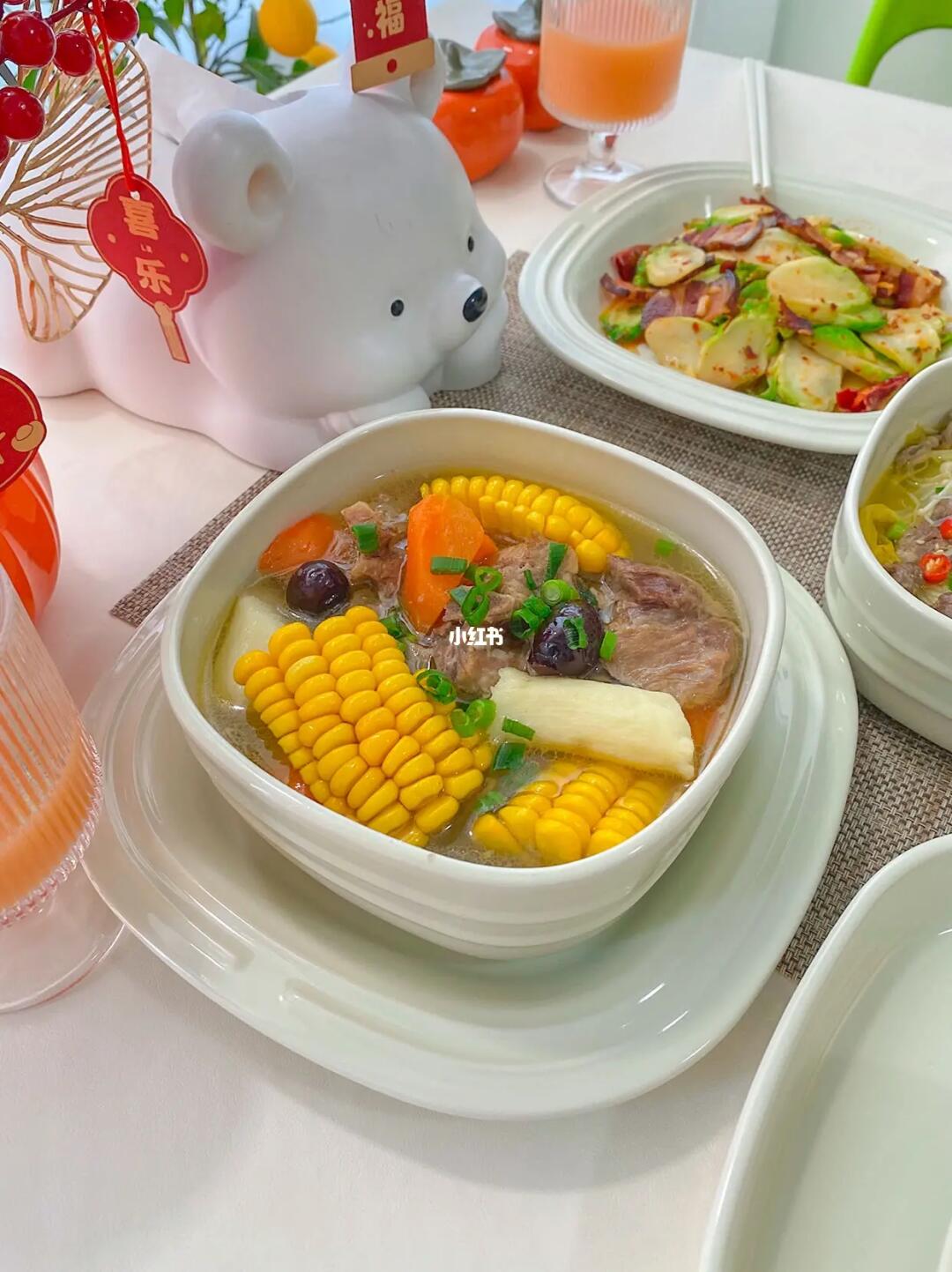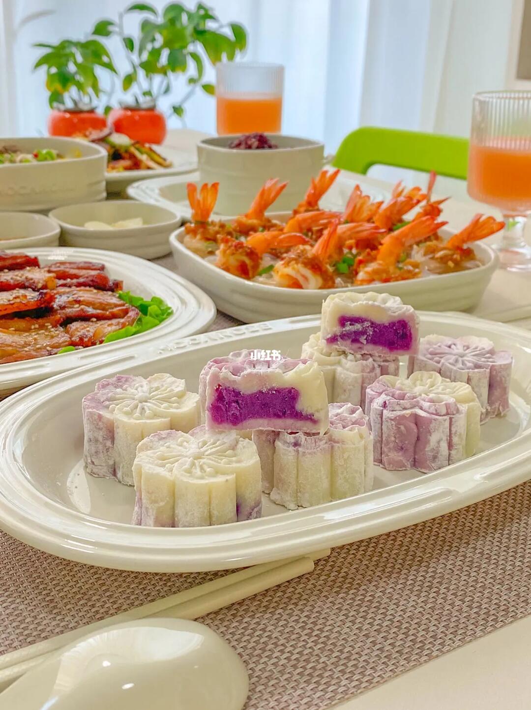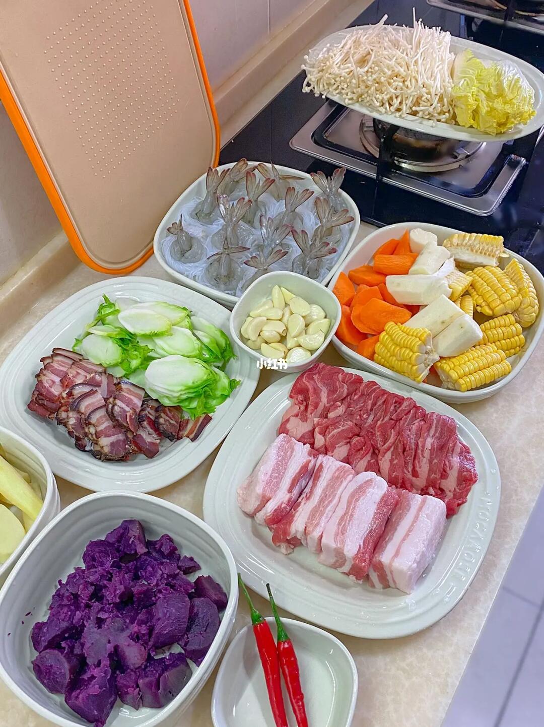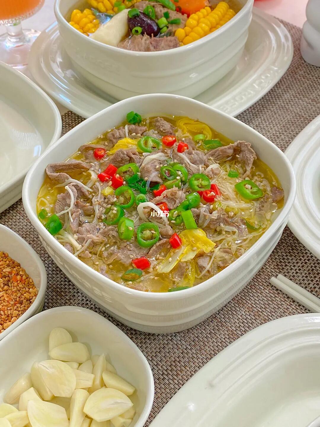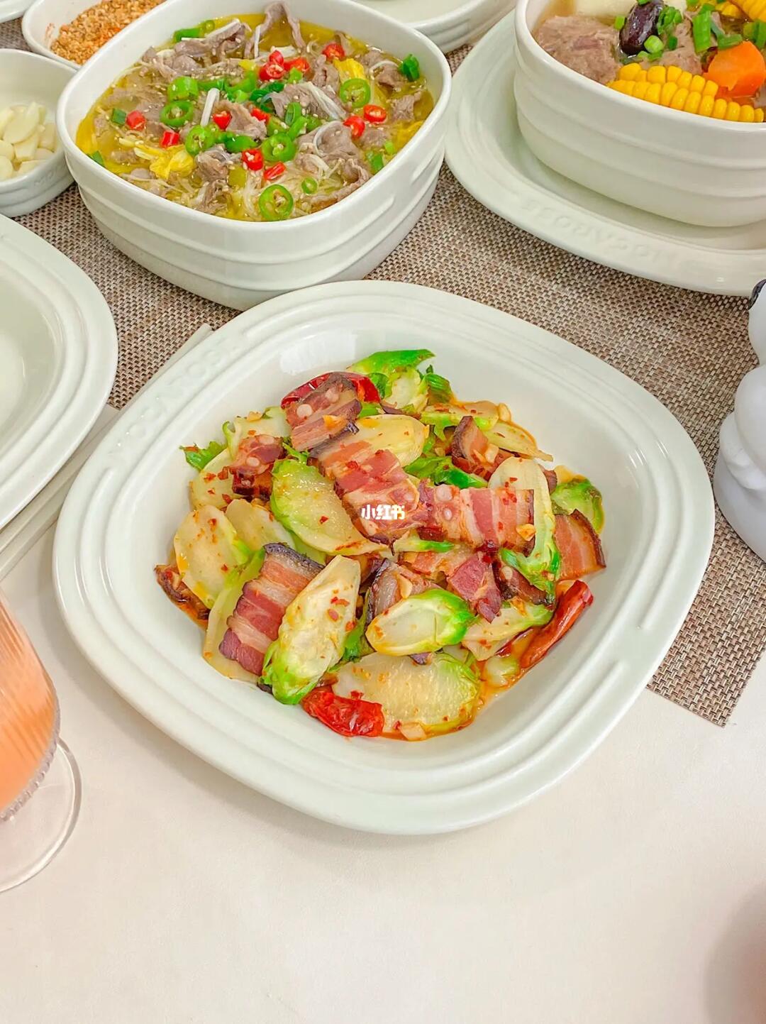 zui好的友情是各自忙乱,互相牵挂,今天的美好从朋友聚餐开始,别人都是宝藏女孩,我们是吃完,又饱又胀的饱胀女孩~哈哈哈哈[大笑R]配上新入的方形餐具,简约的奶白色,不挑菜色🍲,盛装菜肴让人眼前一亮✨。 今日菜单🥣: 1⃣ 蒜蓉粉丝虾 2⃣ 烤五花肉 3⃣ 酸汤肥牛 4⃣ 腊肉炒儿菜 5⃣ 玉米排骨汤 6⃣ 山药紫薯糕 菜品做法见图片~ 碎碎念🌈: 烤五花肉简单又好吃,有手就会系列,先用生抽蚝油盐入个底味,吃的时候蘸上干料,裹上蒜片、生菜,真的很绝,十颗星🌟推荐,五花肉最好选慢养黑猪的。 山药紫薯糕,大小朋友都爱系列,喜欢甜的,揉面环节可以多放炼乳、糖霜,也可以做好了淋果酱,如果吃起来有干粉的味道,可以蒸一下。铺在小烤盘上,食物铺得更开,烤箱受热也会更均匀,熟的也更快~