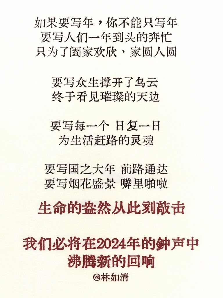 如果要写年|我们必将沸腾于新的回响🎆 如果要写年,你不能只写年 要写人们一年到头的奔忙,只为了阖家欢欣、家圆人圆 要写众生撑开了乌云,终于看见璀璨的天边 要写每一个日复一日为生活赶路的灵魂 要写国之大年、前路通达 要写烟花盛景、噼里啪啦 要写人潮涌动,生命的盎然从此刻敲击 我们必将在2024年的钟声中沸腾新的回响
