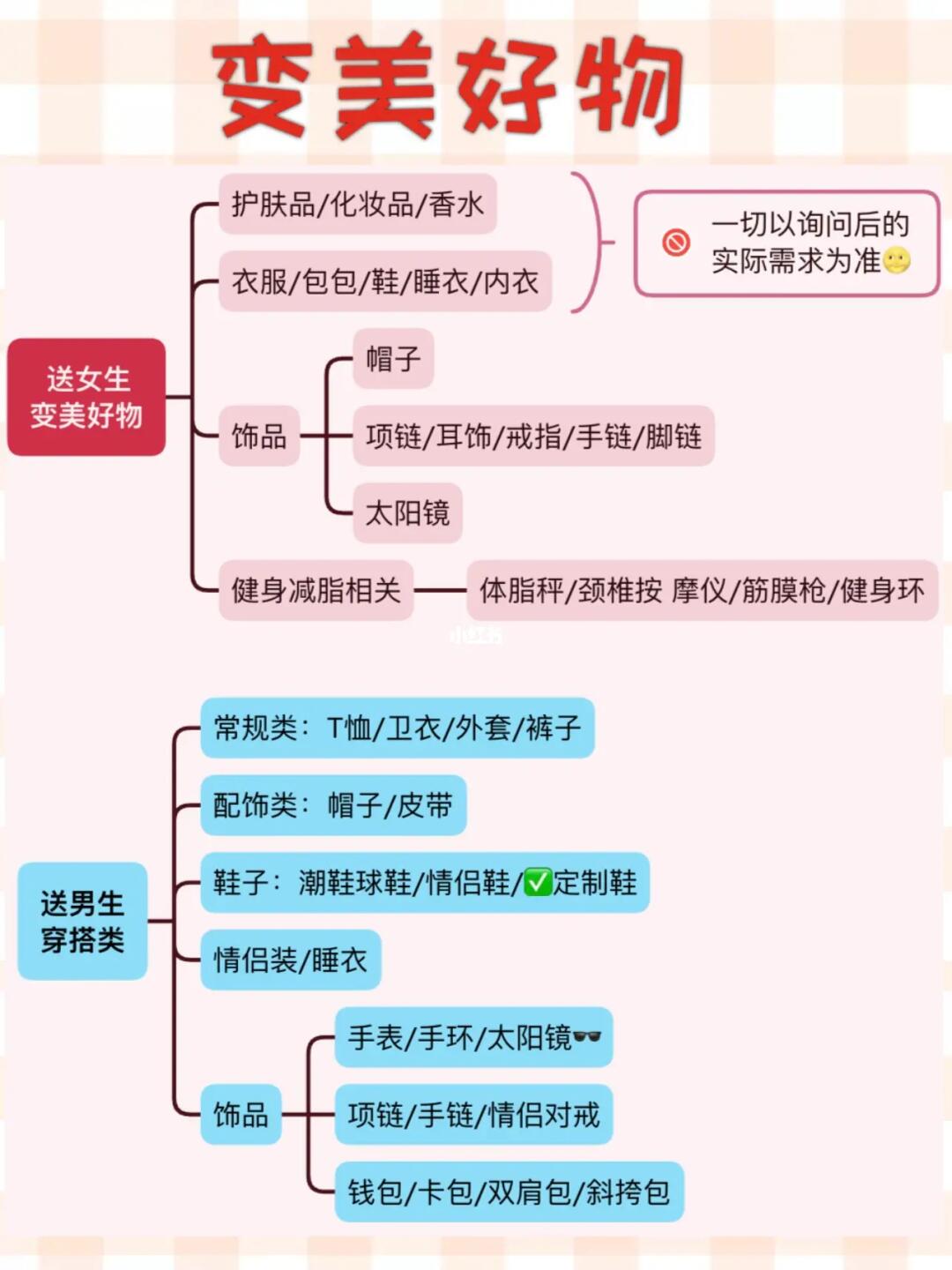 可以考虑护肤品、饰品(首饰、帽子、皮带等)、衣服鞋子包包,还有情侣装、健身相关类