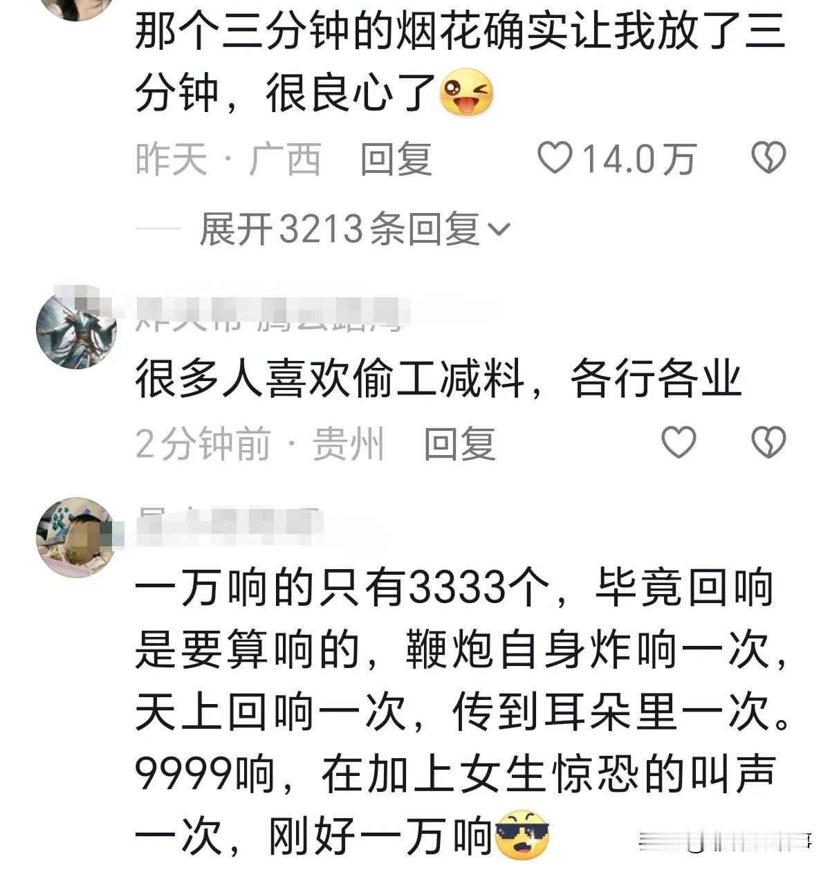 近日黑龙江伊春,男子过年买了一万响的鞭炮,一会就放没了,他感觉这鞭炮肯定有问题,于是男子又去买了鞭炮,花了3个小时在家拆鞭炮,最后发现一万响鞭炮只有三千多响,我是真的佩服这位男士,可以花这么多时间来做这个测试,还事实一个真相。 网友:很多人喜欢偷工减料,各行各业。