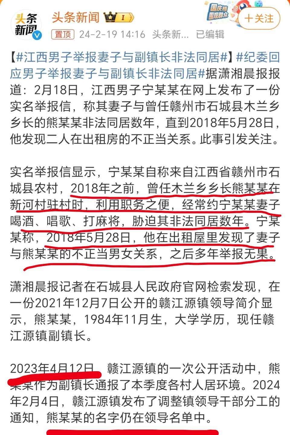 2018年之前熊某任木兰乡乡长的时候就和举报人的老婆搞一起了,2018年5月举报人才发现,多年举报无果,现在熊某都当副镇长了.