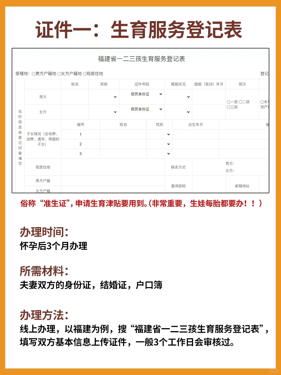 🔸办理方法:线上办理,以福建为例,搜“福建省一二三孩生育服务登记表”,填写双方基本信息上传证件,一般3个工作日会审核过。