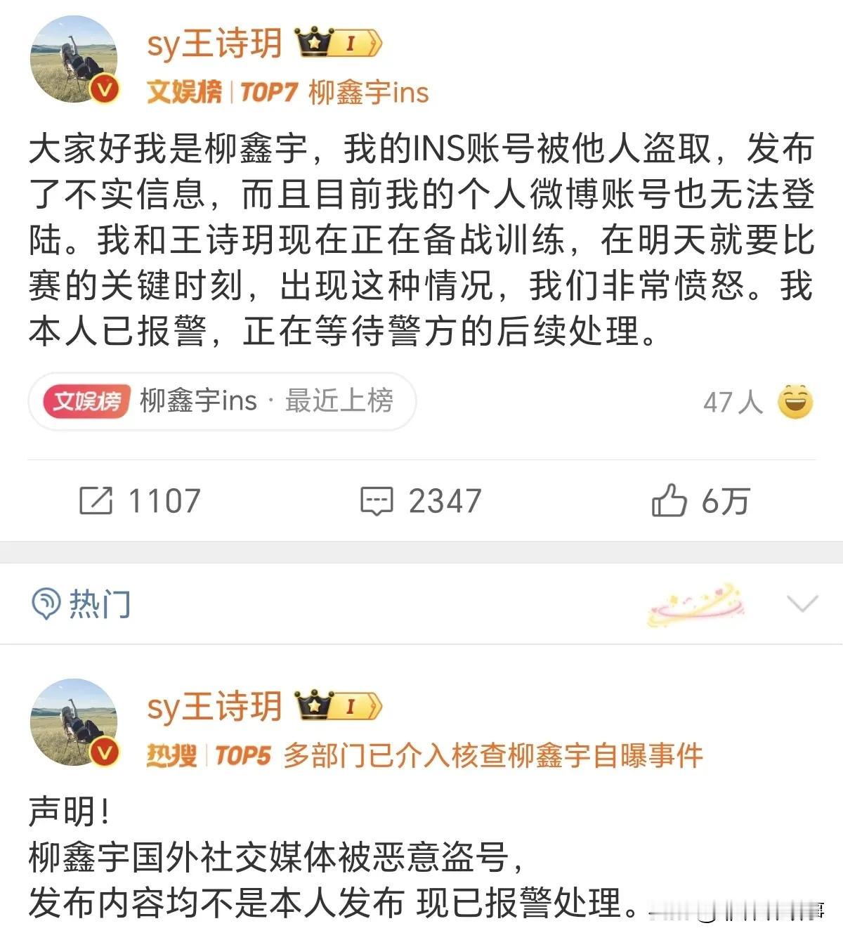 柳鑫宇用王诗玥微博账号澄清:ins自曝强奸未成年人事件是假的,自己的账号被盗用。 柳鑫宇称他和王诗玥两个人明天就要比赛了,今天正在奋战训练,出现这种情况,非常愤怒,本人已经报警,正在等待警方的后续处理。 网友:是不是手机被偷了? 网友:这事不可能是真的相信柳鑫宇的人品。