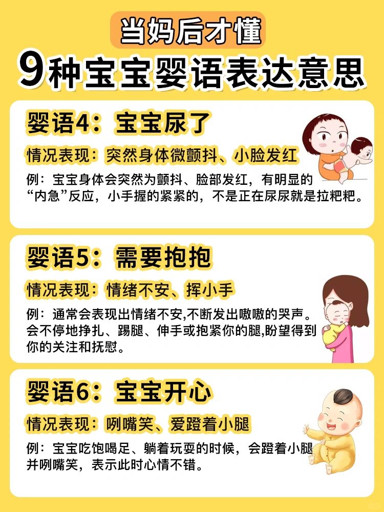 宝太小还不会说话,很多需求只能通过动作、表情和声音来表达。新手爸妈平时要注意多留心宝宝的反应。 总结整理了宝宝9种婴语表达意思,在宝宝发出不同信号时就能轻松判断,及时满足宝宝需求。快收藏起来慢慢看~