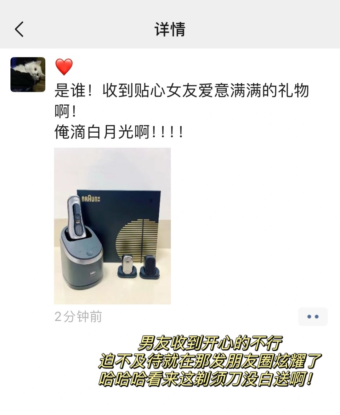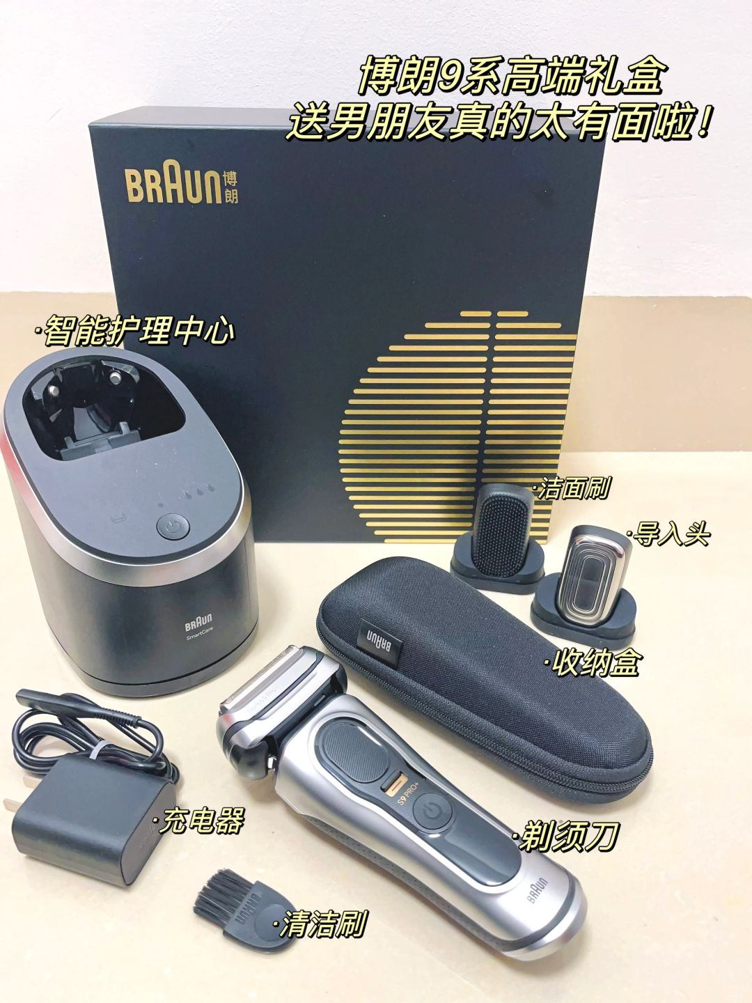 挑了好久最后决定送给他这个高端耐用的博朗9系剃须刀啦,身边男生基本用这牌子的,口碑都蛮好,男友拿到手用起来也说真的剃起来丝滑迅速又干净!带的那个智能护理中心,他超喜欢!每次用完一放就自动清洁杀菌养护充电的,减少了很多麻烦事!也让剃须刀更耐用了!嘿嘿 我可真是太懂他了!想想这剃须刀真没送错,成功喜提一位天天对我心心念念的帅气男友~